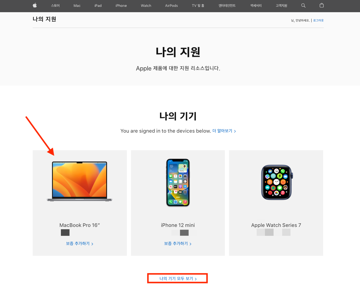 ▼ 3. 나의 기기 모두 보기 메뉴를 눌러 더 많은 기기를 보거나 구매일을 확인하고 싶은 기기를 눌러 진입합니다.
