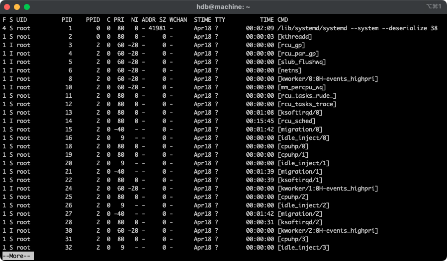 | PPID | Parent Proccess ID의 약자로 프로세스를 생성한 부모의 PID입니다. 고아 프로세스일 경우 PID(1)이 할당됩니다. |