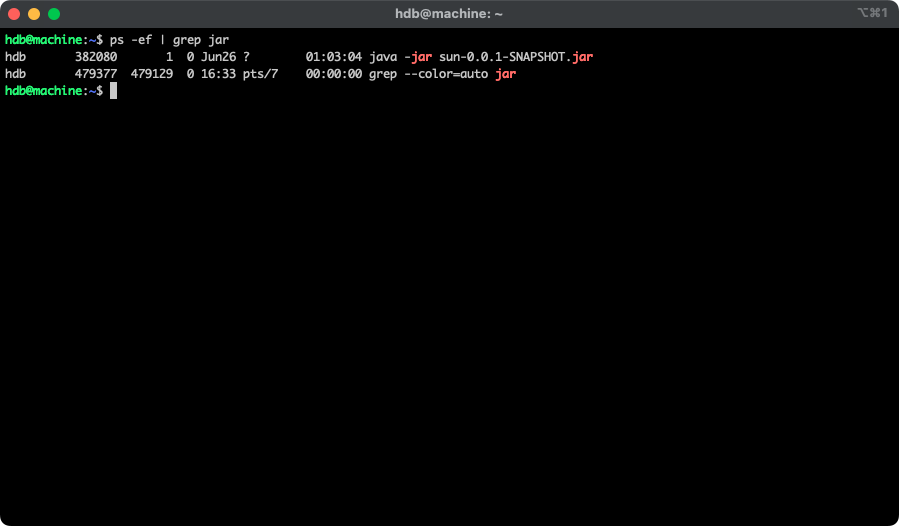 만약 jar에 대한 프로세스 PID를 찾으려고 하면 다음과 같은 명령어로 확인할 수 있습니다.