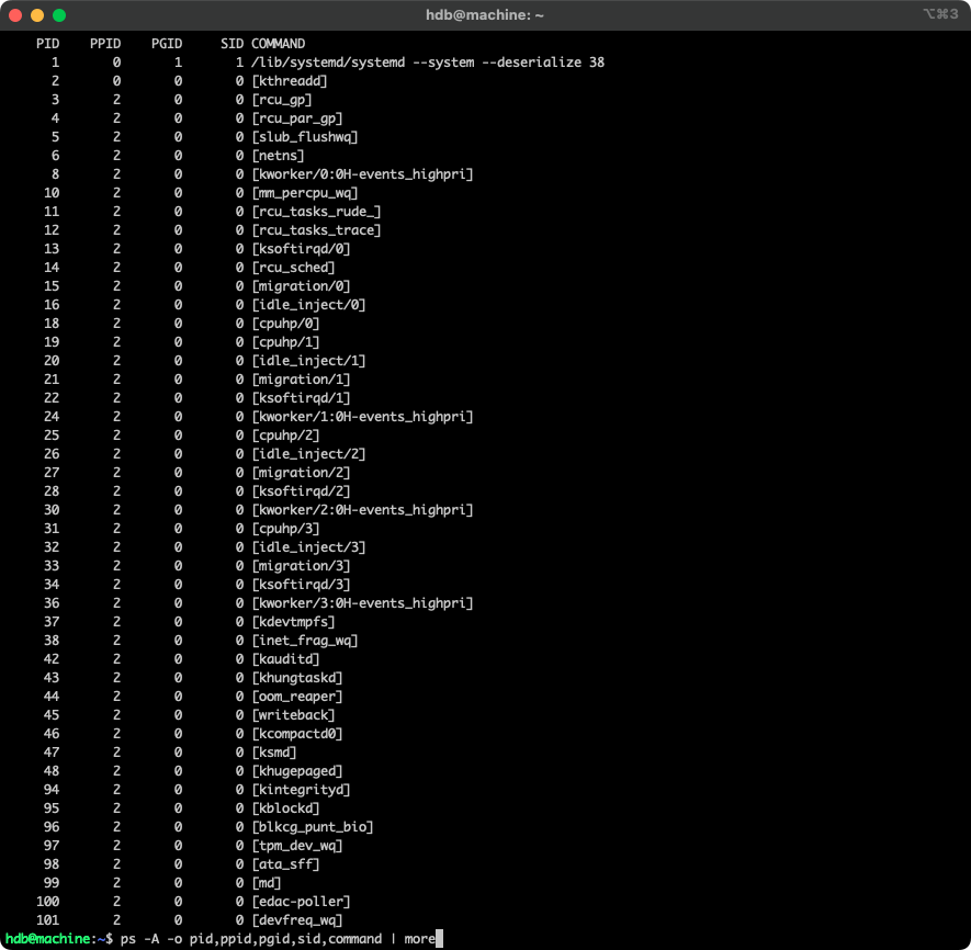 ps -A -o pid,ppid,pgid,sid,command | more