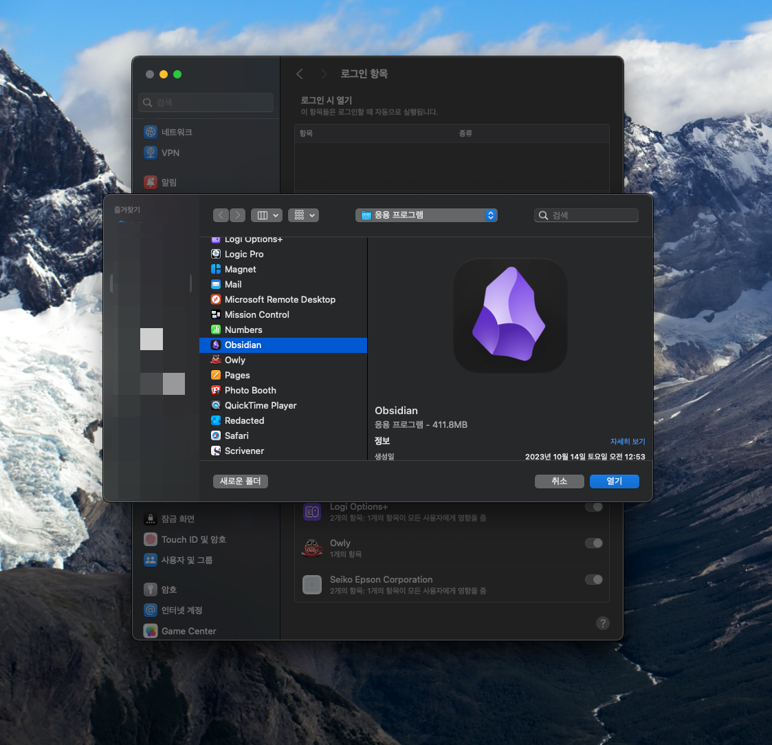 ▼ 3. 제가 자주쓰는 옵시디언 앱을 선택해보겠습니다. 원하는 프로그램을 누르고 열기 버튼을 눌러 선택합니다.