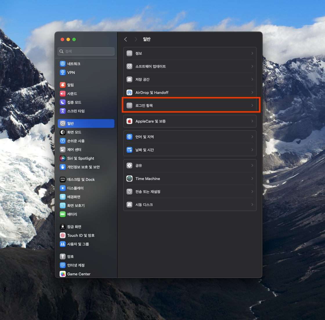 ▼ 1. 설정 > 일반 > 로그인 항목 메뉴를 선택합니다.