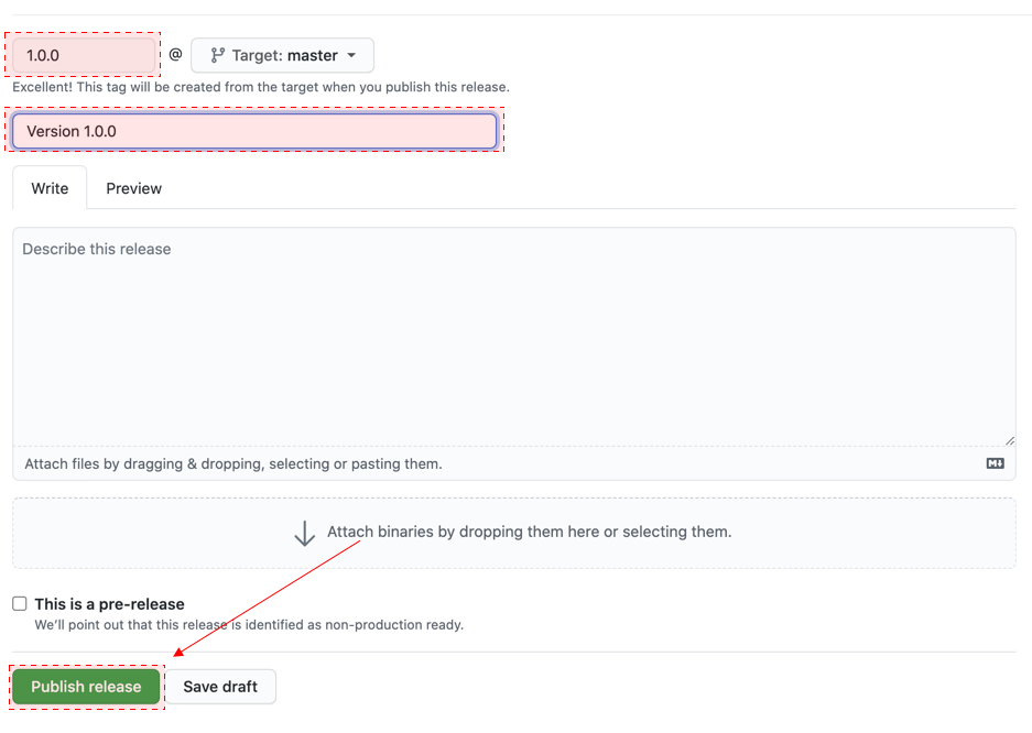이제 새로운 버전을 생성합니다. 이는 코코아팟스 Spec 파일에 버전과 동일해야 합니다. 위쪽에 1.0.0의 버전으로 태그가 자동 생성됩니다. 만약 이 버전이 동일하지 않다면 CocoaPods 프로젝트 업로드 시에 문제가 발생합니다. 매번 소스를 올릴 때마다 릴리즈를 해주어야 합니다.