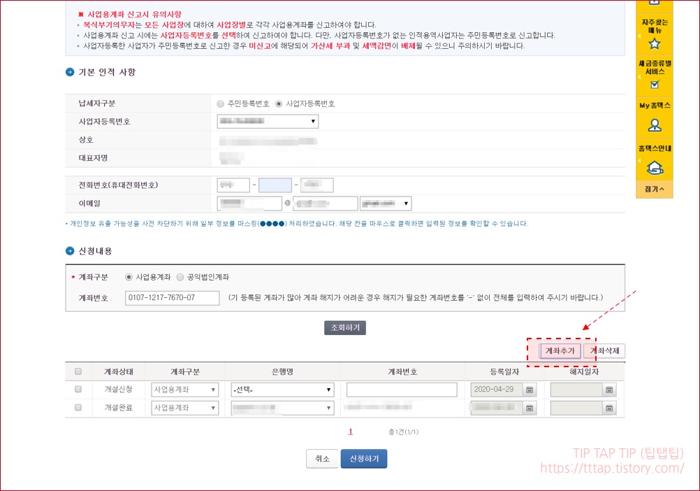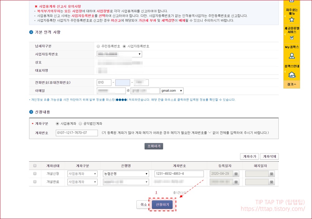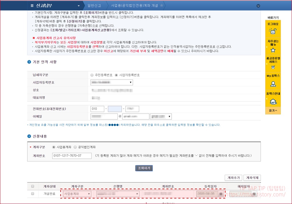 [국세청 홈택스] 사업자계좌 발급 등록하기