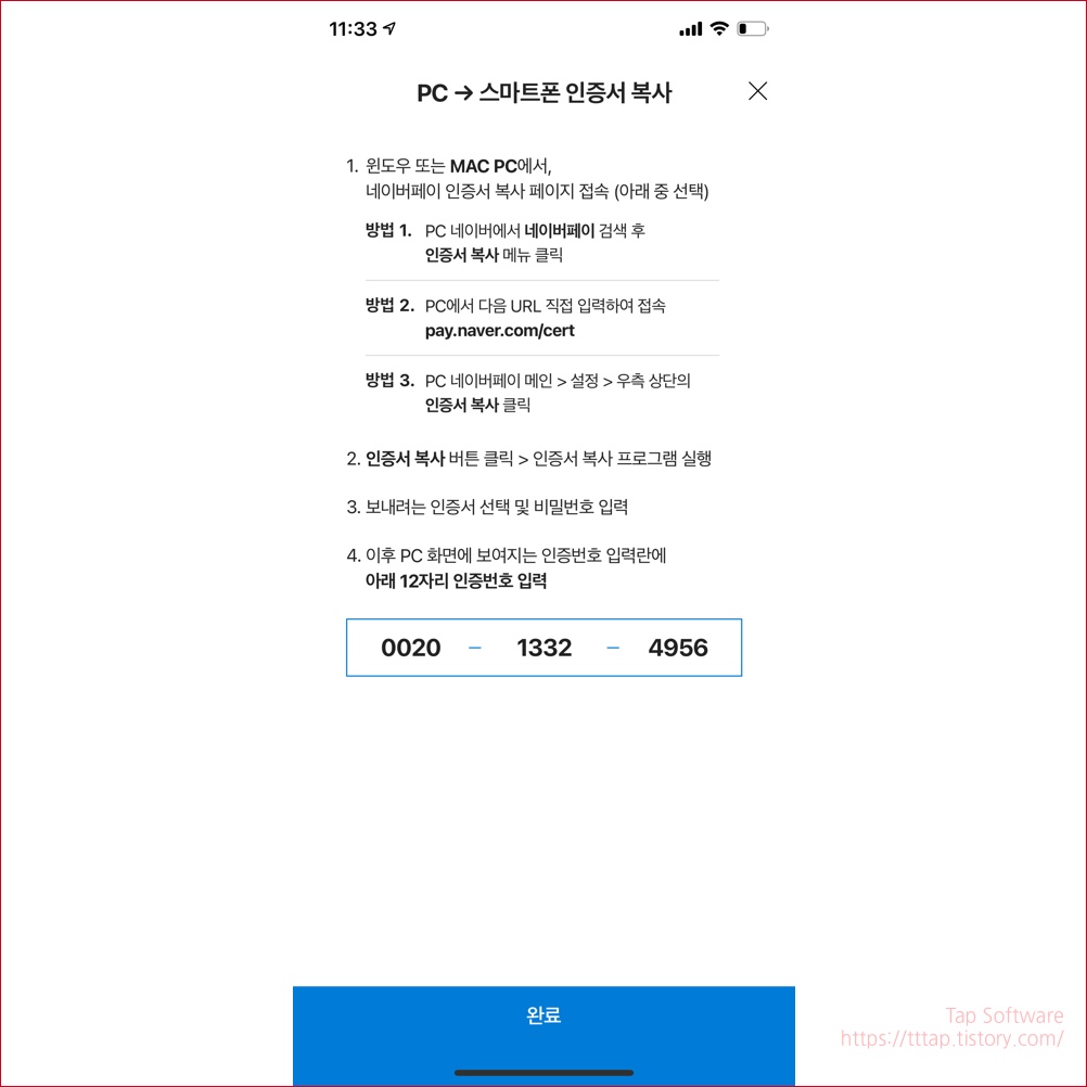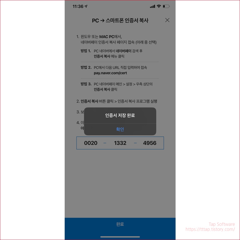 ▼ 11. 이제 스마트폰에서 완료 버튼을 누르면 인증서 저장 완료 팝업을 보실 수 있어요.