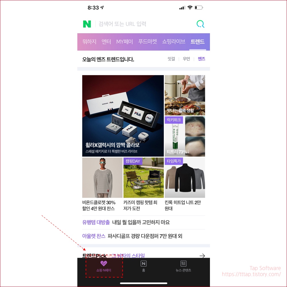 ▼ 1. 네이버 페이 메인으로 이동합니다. 네이버 앱 또는 웹에서 하단 메뉴를 선택하면 이동할 수 있어요.