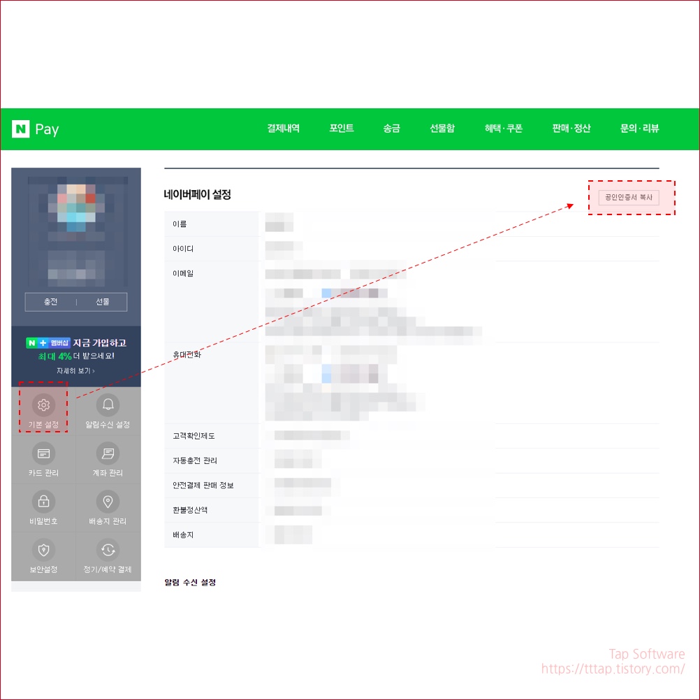 ▼ 7. PC에서 네이버페이 홈으로 이동합니다. pay.naver.com 그냥 네이버에서 검색해서 들어가면 모바일 네이버 페이 홈으로 이동하더라고요. 주소창에 해당 주소를 입력하고 들어갑니다. 왼쪽 상단에 기본 설정을 누르면 우측 상단에 공인인증서 복사 메뉴를 볼 수 있어요. 버튼을 선택합니다.