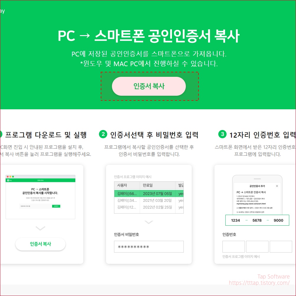 ▼ 8. PC -> 스마트폰 공인인증서 복사 화면에서 인증서 복사 버튼을 누릅니다.