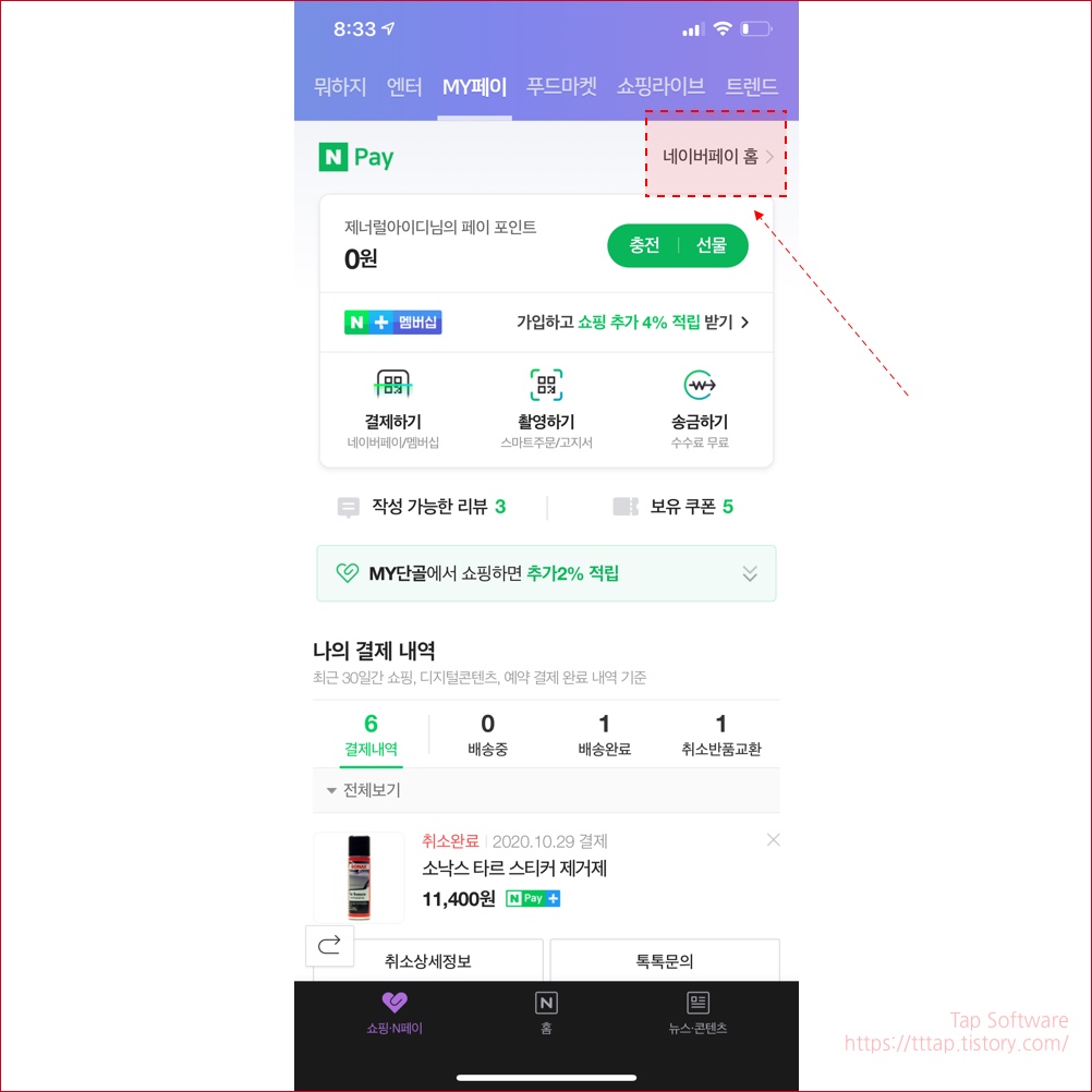 ▼ 2. 네이버 페이 홈 버튼을 선택합니다.