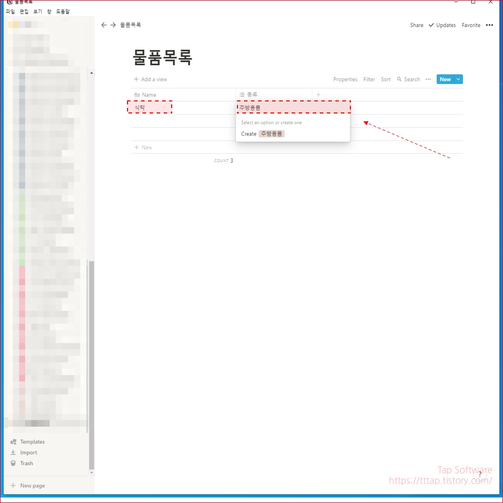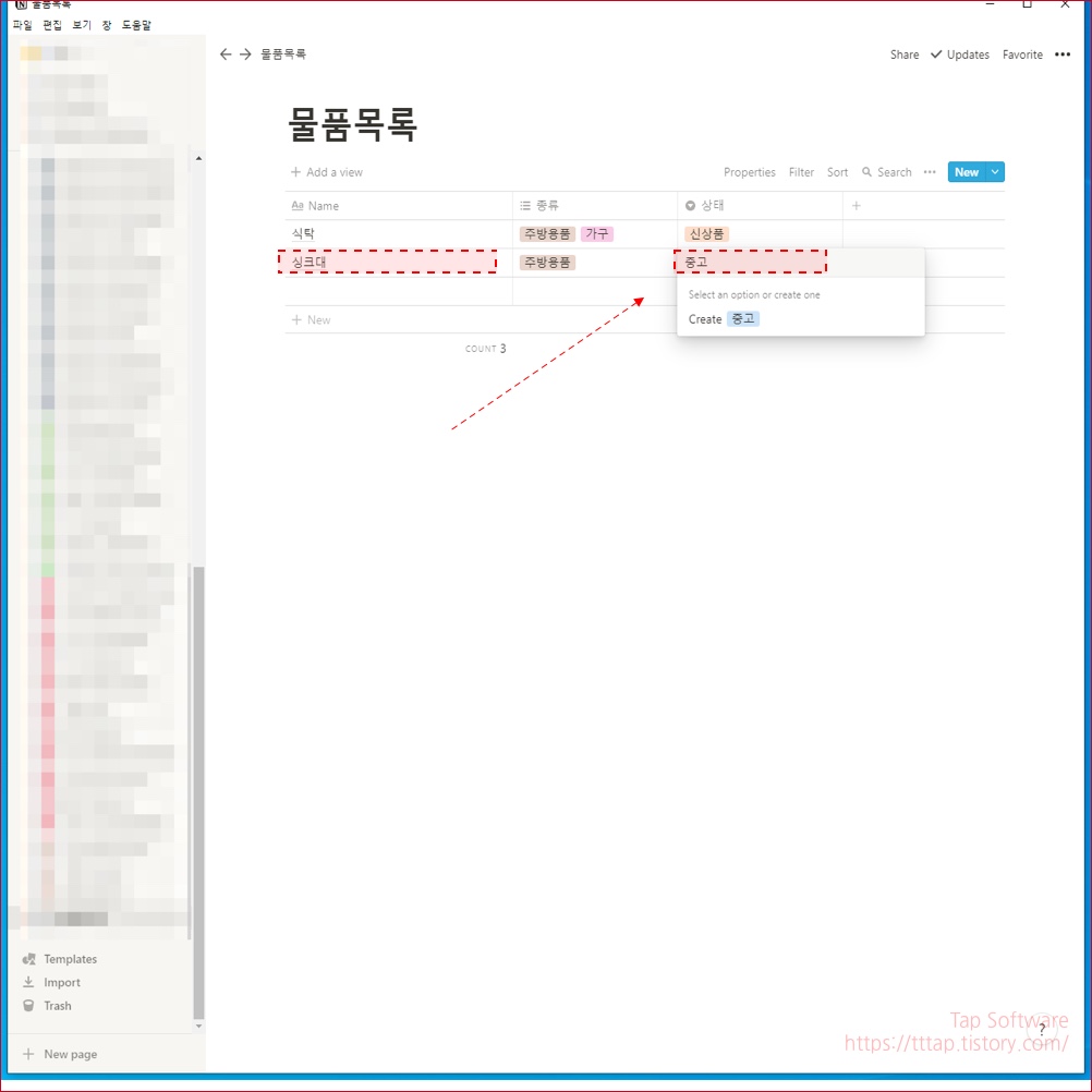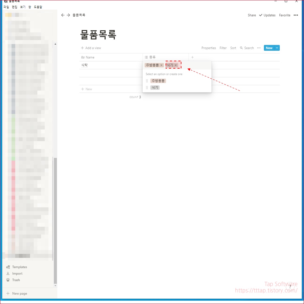 ▼ 5. '식탁'이라는 값을 하나 추가합니다. 그리고 주방용품이라는 태그를 하나 추가할게요. 종류 밑에 공간을 선택하시면 태그 입력이 가능합니다. 입력 후 Create 주방용품을 클릭하거나 엔터를 치시면 돼요.