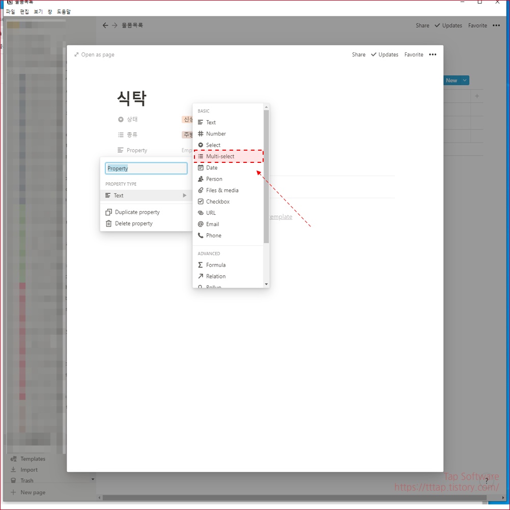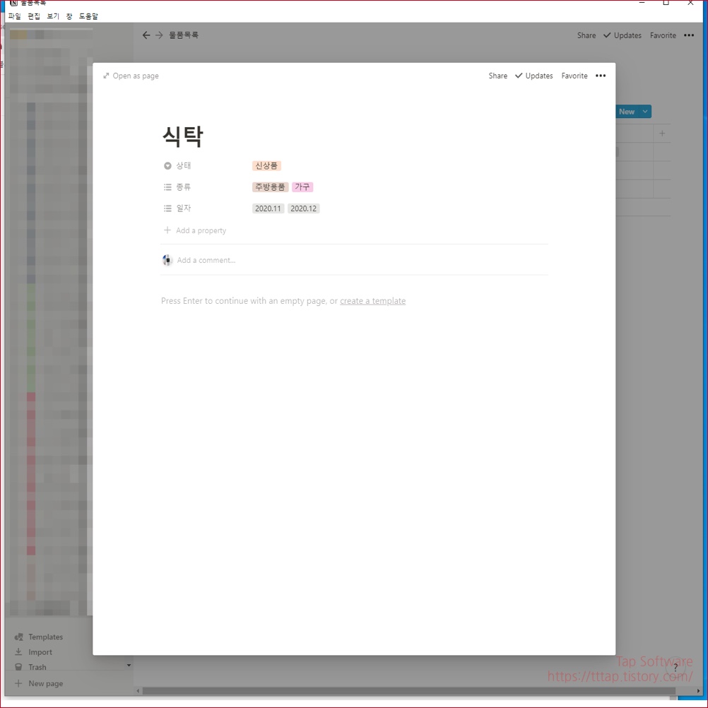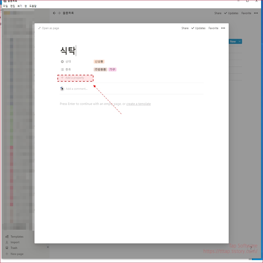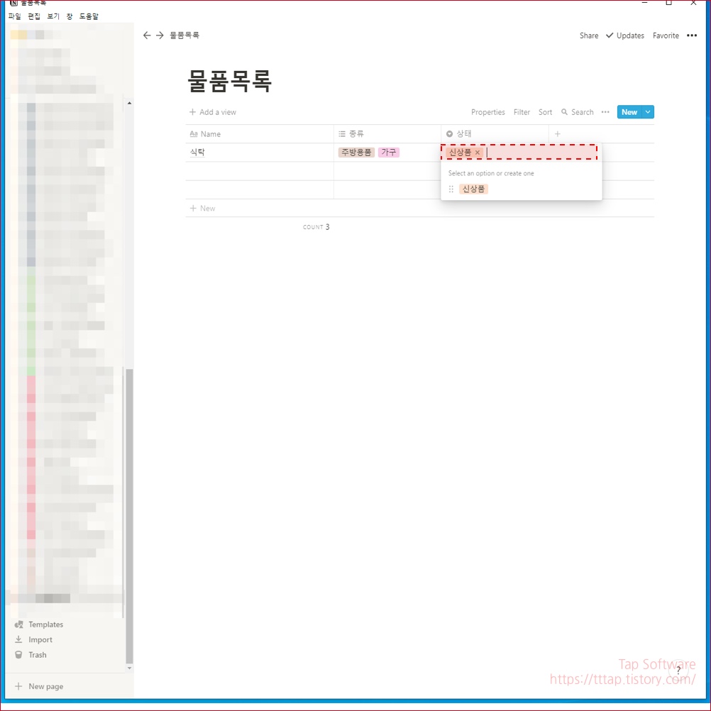 ▼ 5. '식탁'이라는 값을 하나 추가합니다. 그리고 주방용품이라는 태그를 하나 추가할게요. 종류 밑에 공간을 선택하시면 태그 입력이 가능합니다. 입력 후 Create 주방용품을 클릭하거나 엔터를 치시면 돼요.