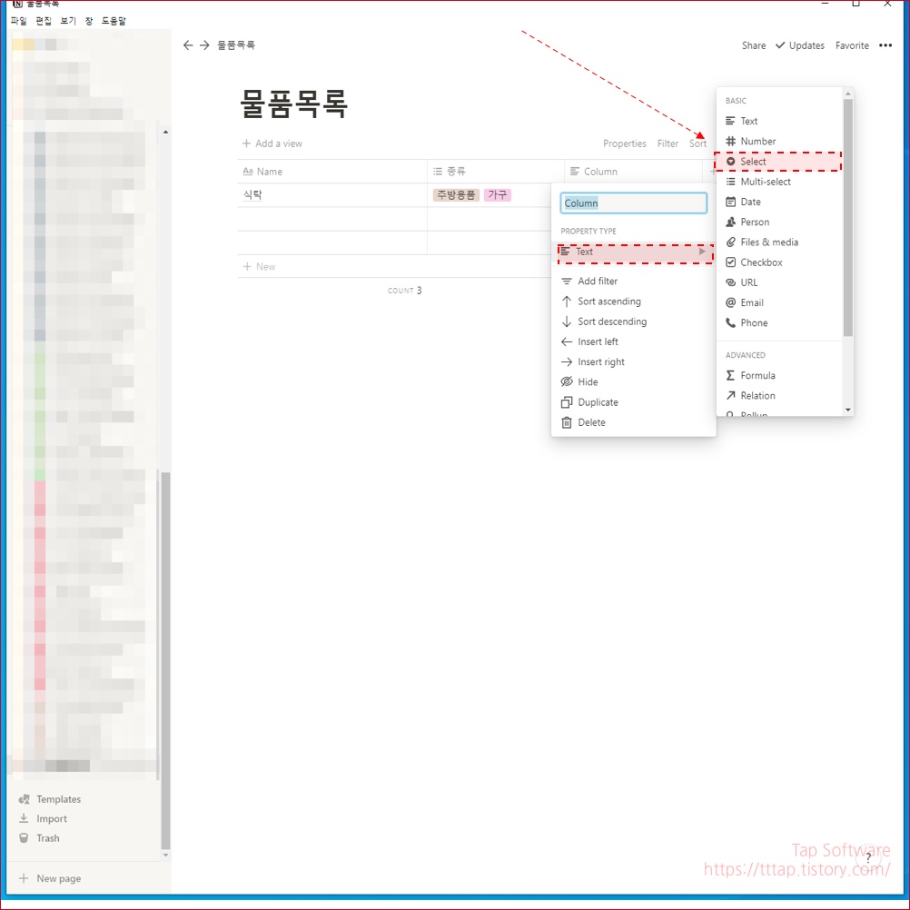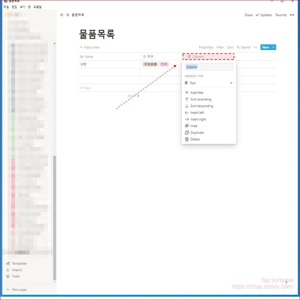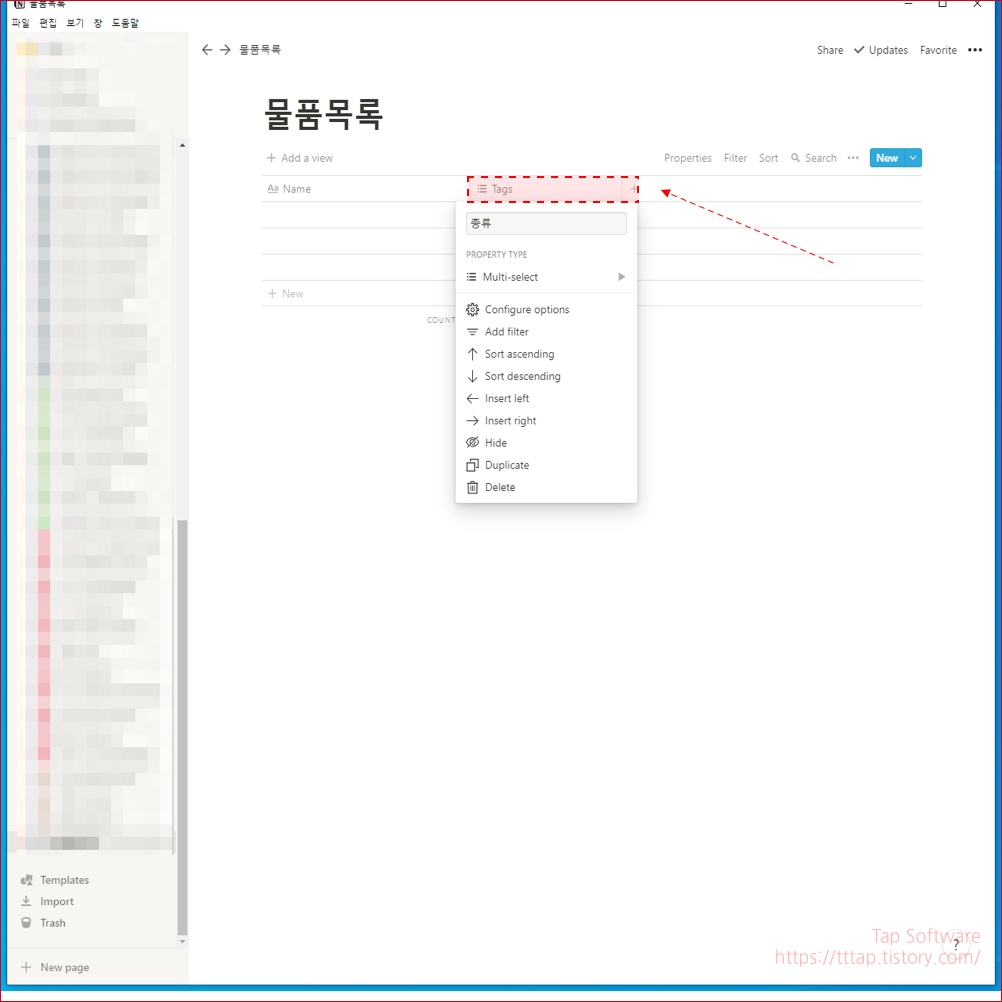 ▼ 4. 기본적으로 만들어져 있는 Tags 컬럼을 선택합니다. 이름을 종류로 바꿔줄게요.