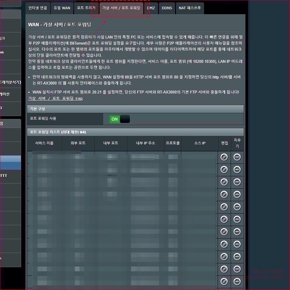 공유기를 교체하게 되어서 포트포워딩(Port Forwading)을 모두 다시 해야 합니다. 개인적인 생각으로 아수스 공유기가 iptime에 비해서 더 우수한 인터페이스를 가지고 있습니다. 포트 포워딩도 좀 더 명시적으로 할 수 있는 것 같습니다. 포트포워딩이란 컴퓨터의 네트워크에서 하나의 IP주소와 포트 번호 결합의 통신 요청을 다른 쪽으로 넘겨 마치 여러 대의 컴퓨터의 네트워크 포트를 한 컴퓨터에서 발생하는 패킷처럼 분리해서 실행하는 방식입니다.