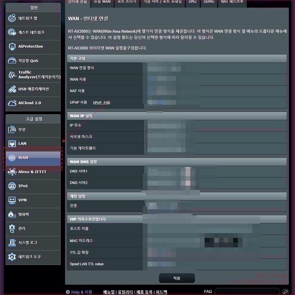 ▼ 1. 공유기 설정 페이지에서 왼쪽 사이드 메뉴중에 WAN 메뉴를 선택합니다.
