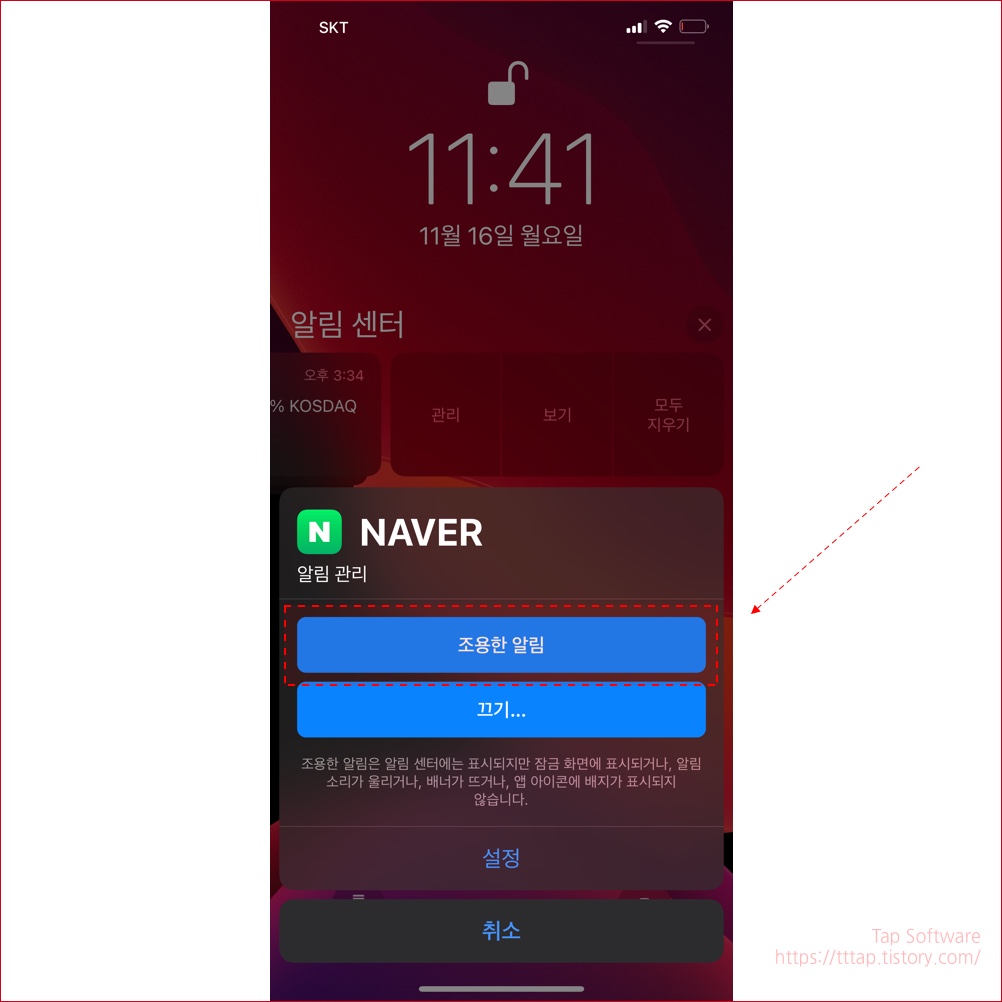 ▼ 2. 관리 버튼을 누르면 하단에서 팝업이 노출됩니다. 조용한 알림으로 선택합니다.