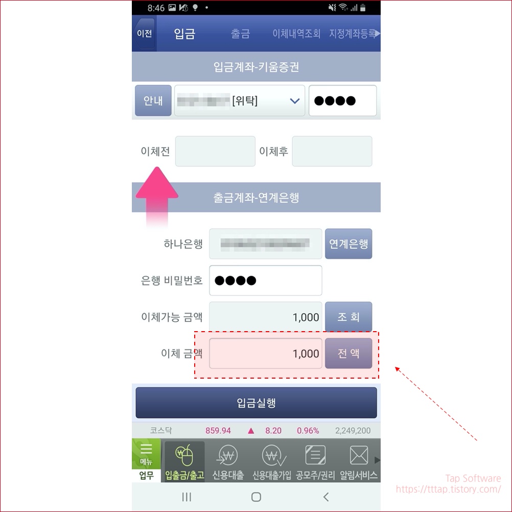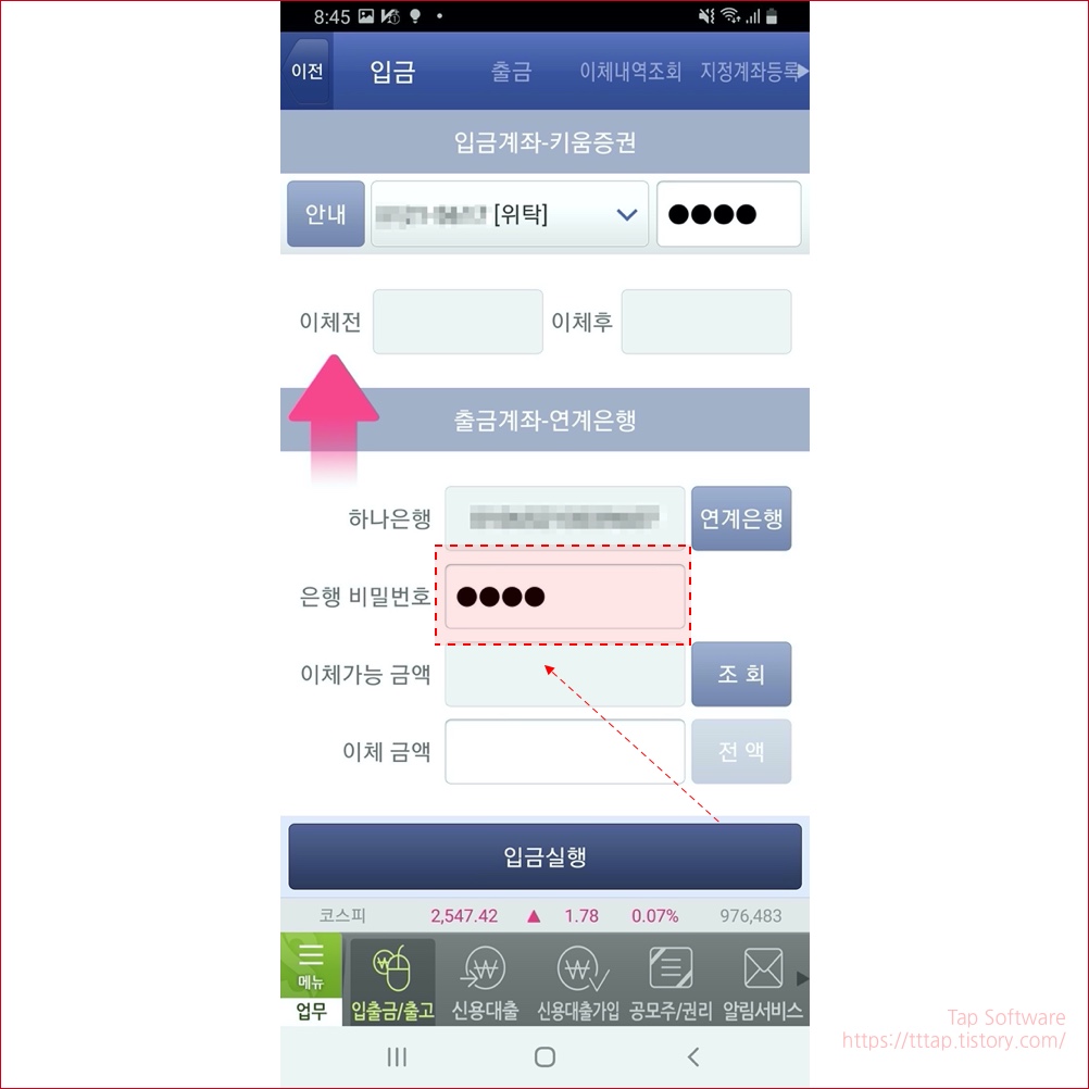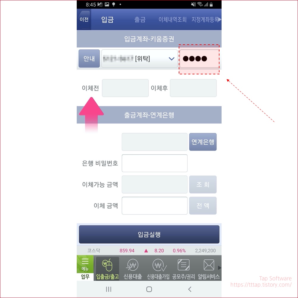 ▼ 3. 입금 화면에서 오른쪽 상단에 계좌비밀번호를 입력합니다.