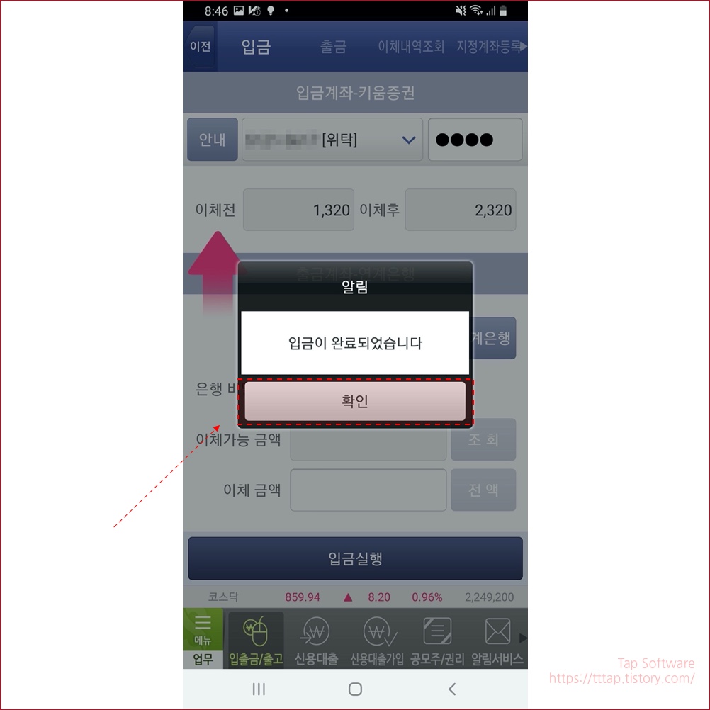 ▼ 9. 입금이 완료되었습니다. 라는 팝업이 뜹니다. 확인버튼을 눌러서 종료합니다.