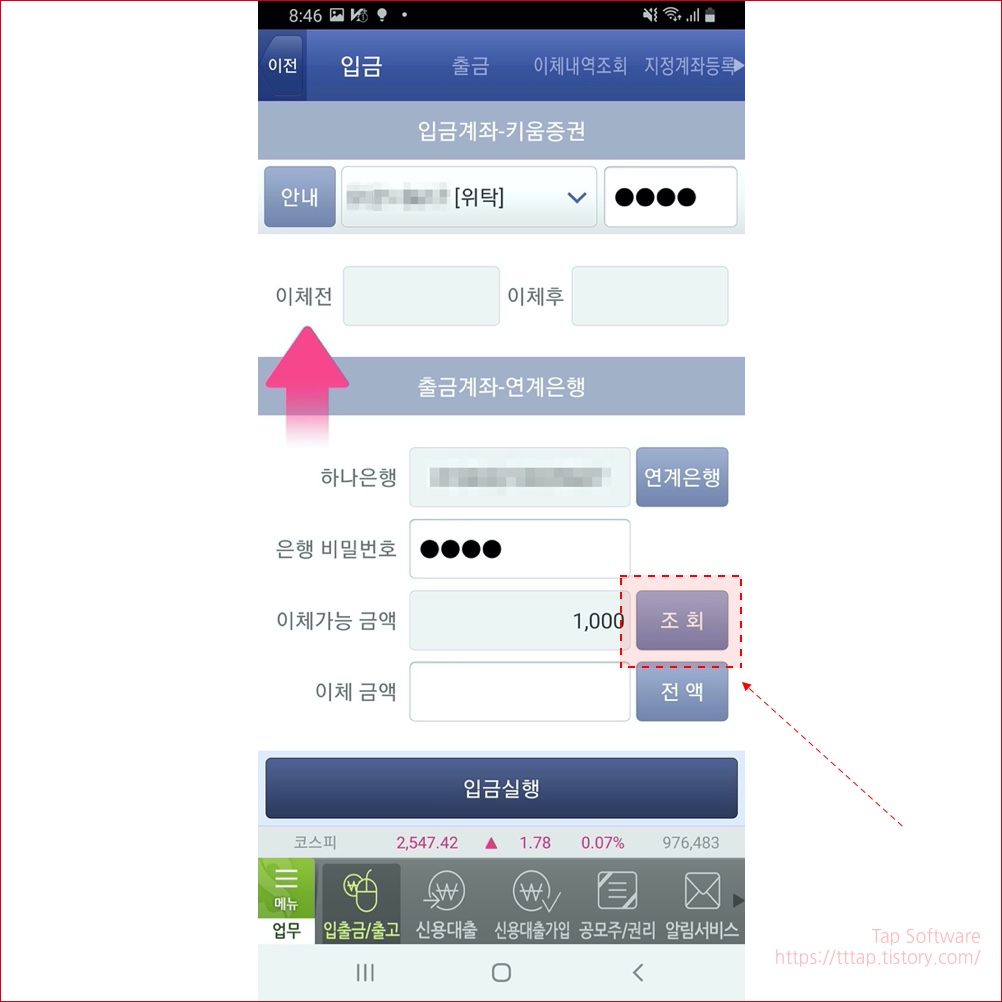 ▼ 6. 이체가능 금액을 조회합니다. 1,000원을 미리 넣어놨어요.