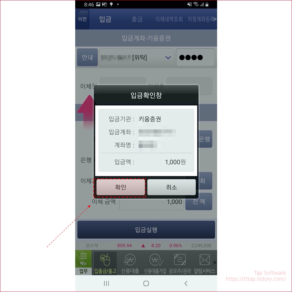 ▼ 8. 입금확인창이 뜹니다. 입금내용을 확인하고 확인 버튼을 누릅니다.