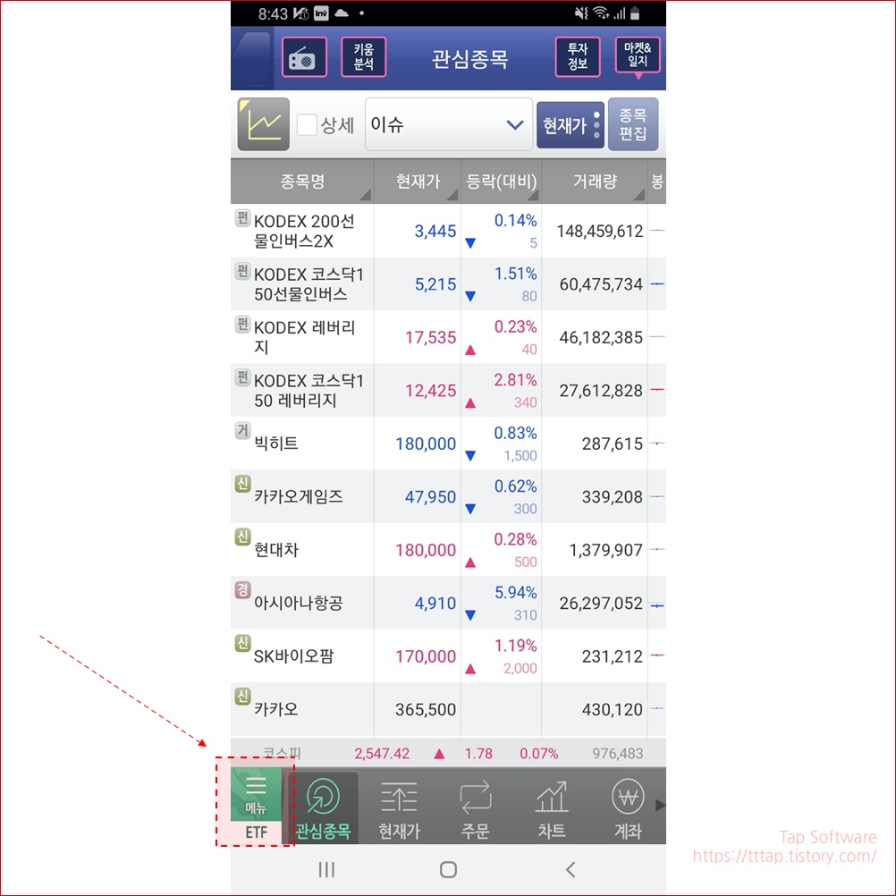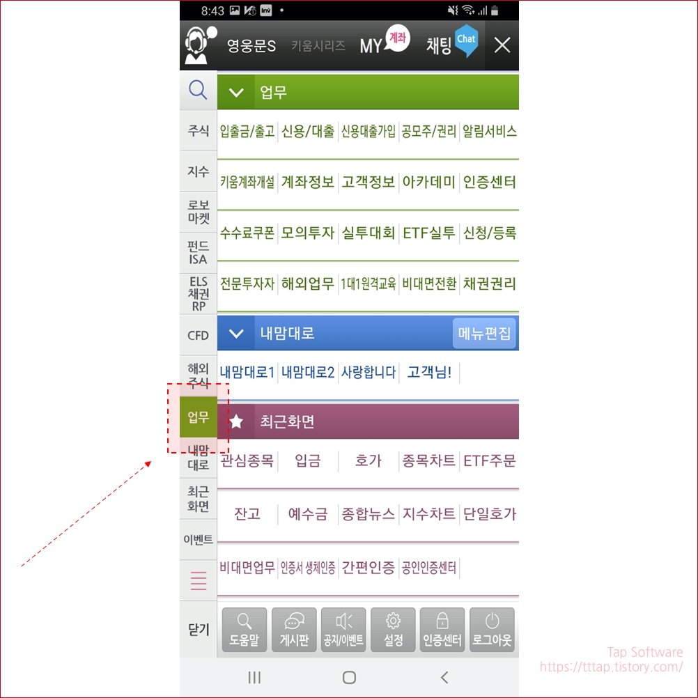 ▼ 1. 영웅문 S 메인화면입니다. 왼쪽 하단에 메뉴 버튼을 눌러서 이동합니다.
