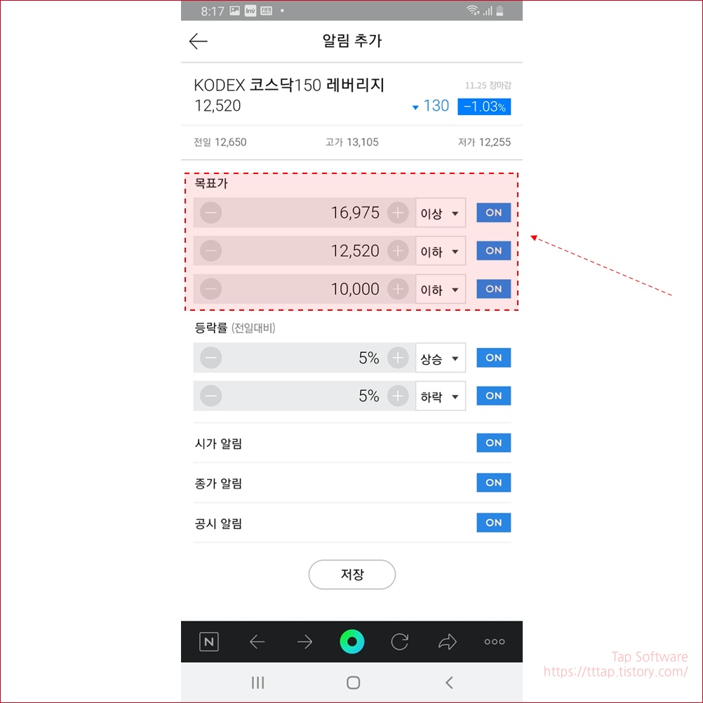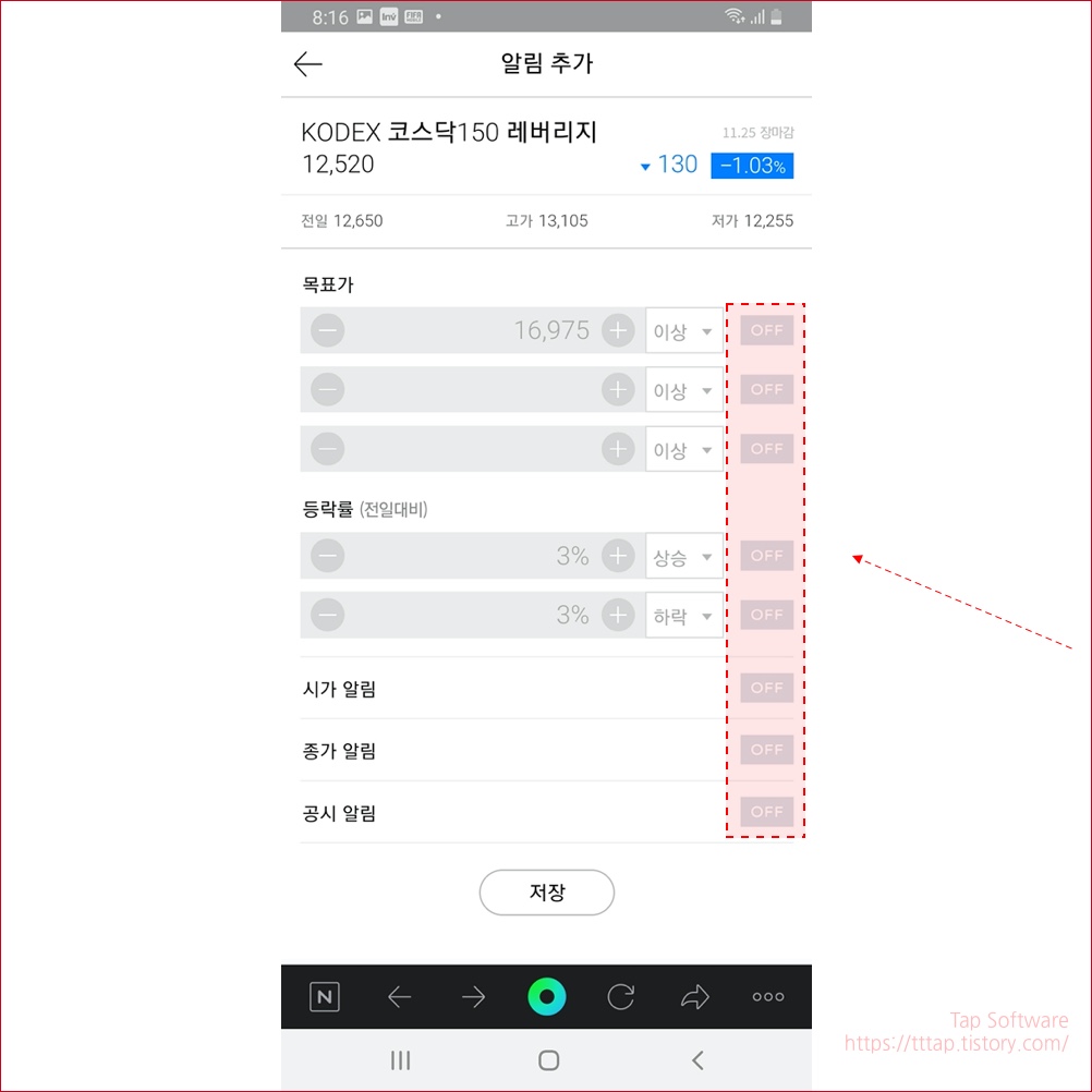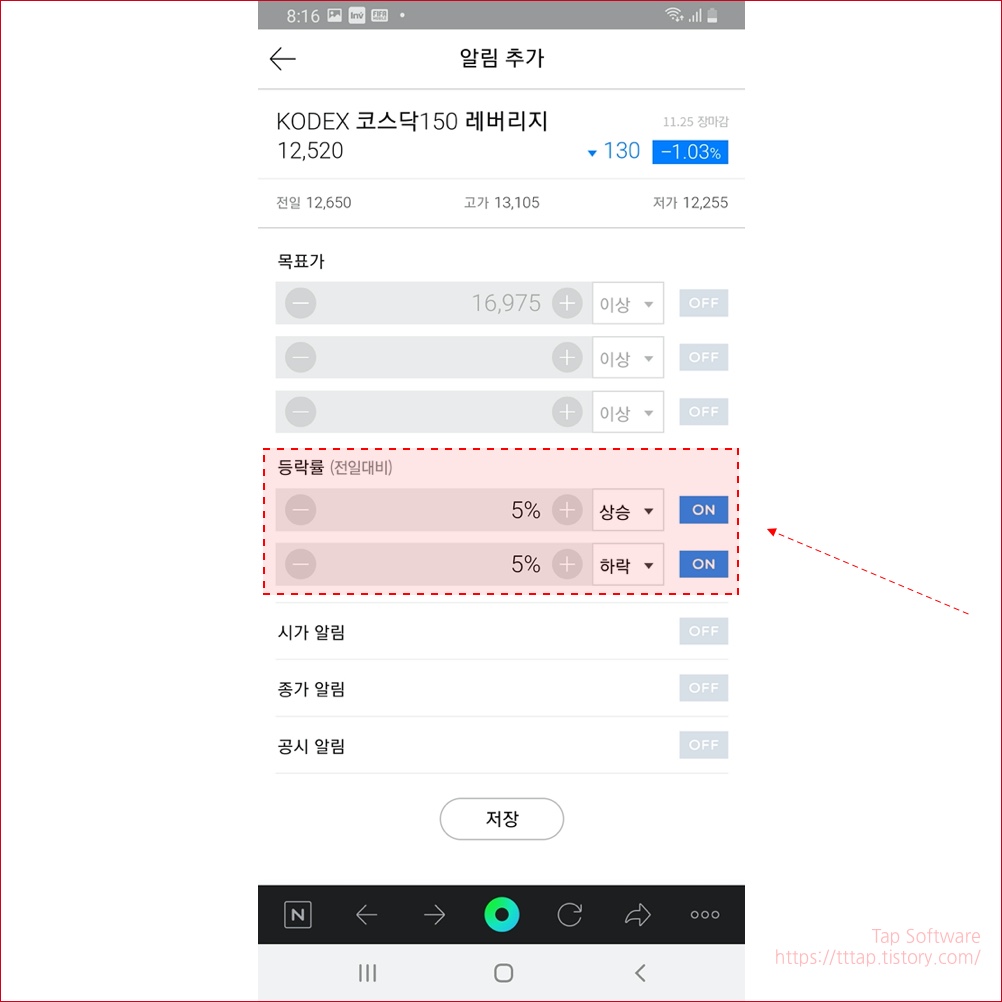 ▼ 10. 다음은 목표가 설정입니다. 만약 나는 이 가격 이상 아니면 절대 안 팔겠다 하면 이 목표가 설정이 좋죠. 물론 하락도 선택이 가능합니다. 금액을 적어줘야 하고요. 역시 하락 상승 구분도 해줘야 합니다. 마지막으로 시가, 종가, 공시 알림이 있는데 관심이 있는 종목이라면 전체 켜주는 게 좋겠죠?