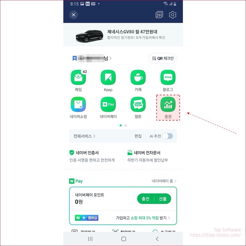 ▼ 2. 메뉴중에 증권 메뉴를 선택합니다. 만약 없다면 다음 탭을 넘겨서 확인합니다 그래도 없다면 설정에서 추가하실 수 있어요.