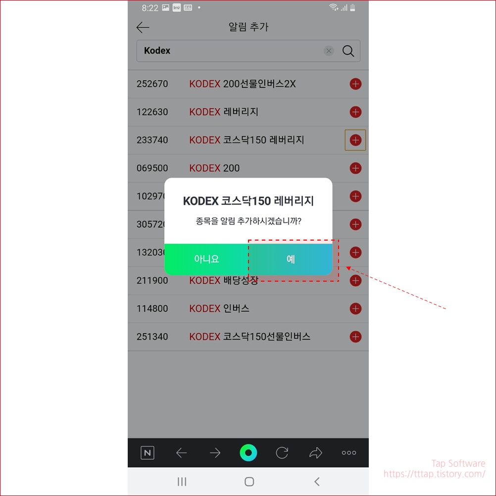 ▼ 7. 추가하기 전에 해당 종목을 추가할지 물어보는 팝업이 뜹니다. 확인을 눌러서 주식 종목을 추가합니다. 저는 코스닥 레버리지를 추가했습니다. 지수를 추종하는 종목의 알림은 꼭 필요한 것 같습니다.