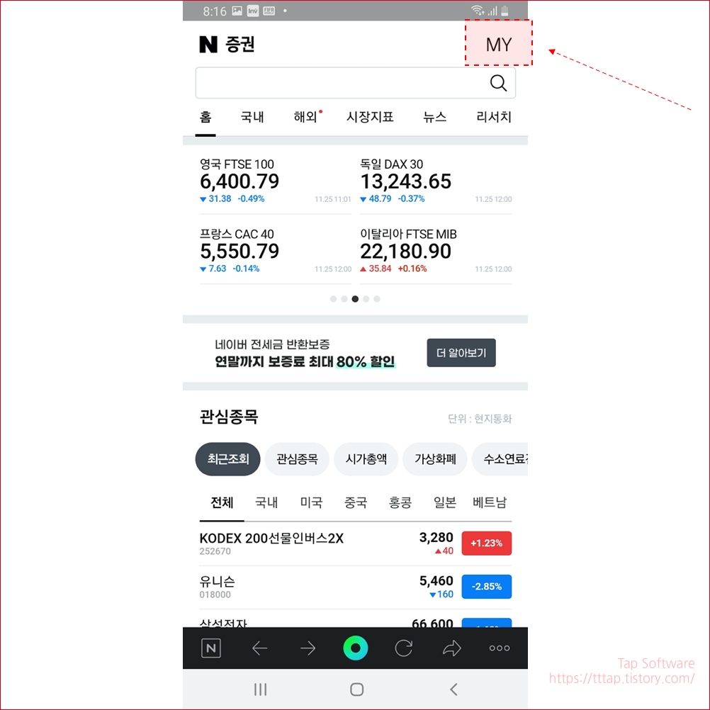 ▼ 3. 네이버 증권 메인입니다. 증권 화면 우측 상단에 MY 버튼을 눌러 개인 설정으로 이동합니다.