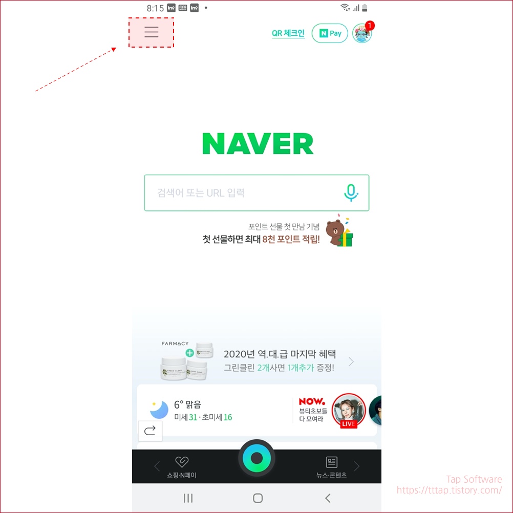▼ 1. 네이버 증권 메인으로 가기 위해서 네이버 앱에서 왼쪽 상단 메뉴를 선택합니다.