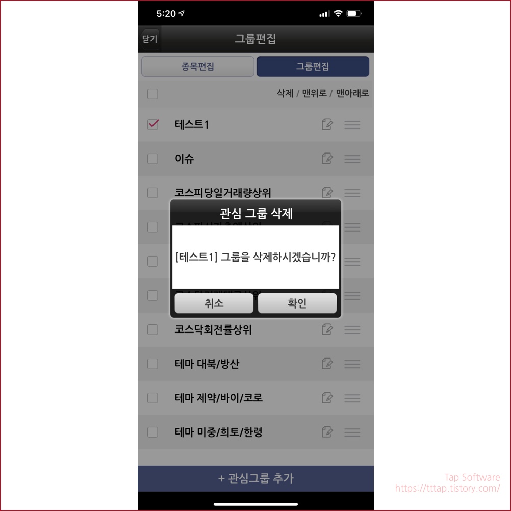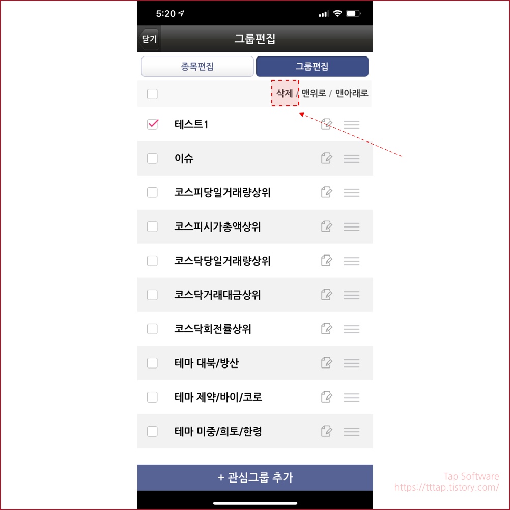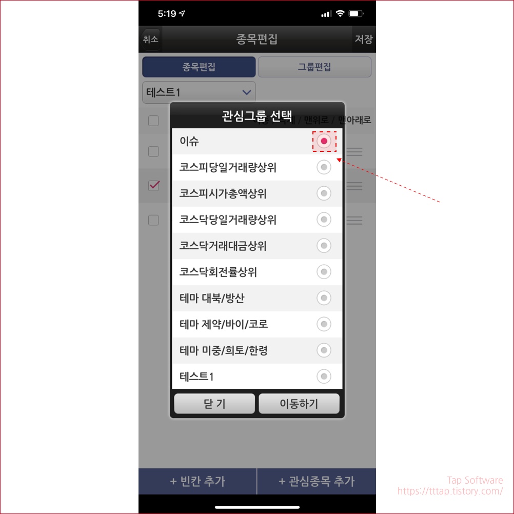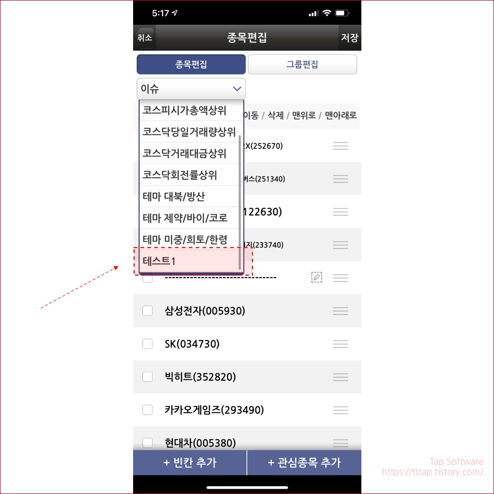 ▼ 7. 두 번째로 종목을 추가 삭제할 그룹을 선택해줍니다. 조금 전에 만들었던 '테스트1' 목록이 맨아래 있네요.