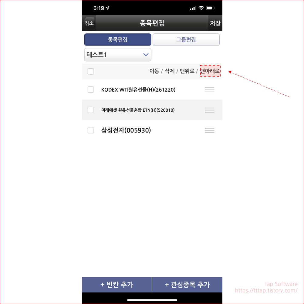 ▼ 16. 반대로 더이상 잘 보지 않는 종목은 맨아래로 내릴 수 있습니다.아이템을 선택하고 맨아래로 기능 버튼을 눌러서 삼성전자를 내려보았습니다.