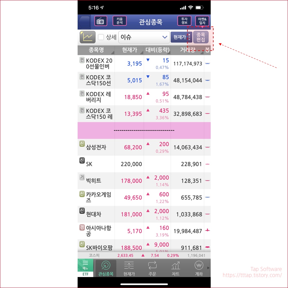 ▼ 1. 영웅문 S 관심종목 화면에서 우측 상단에 종목 편집 버튼을 누릅니다.