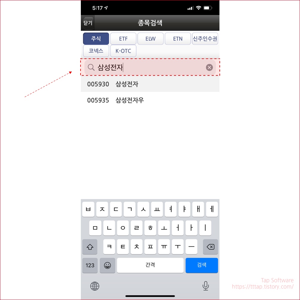 ▼ 11. 해당 종목을 검색하고 종목을 탭하면 추가되는 것을 확인할 수 있습니다. 새롭게 삼성전자 종목이 추가되었습니다.