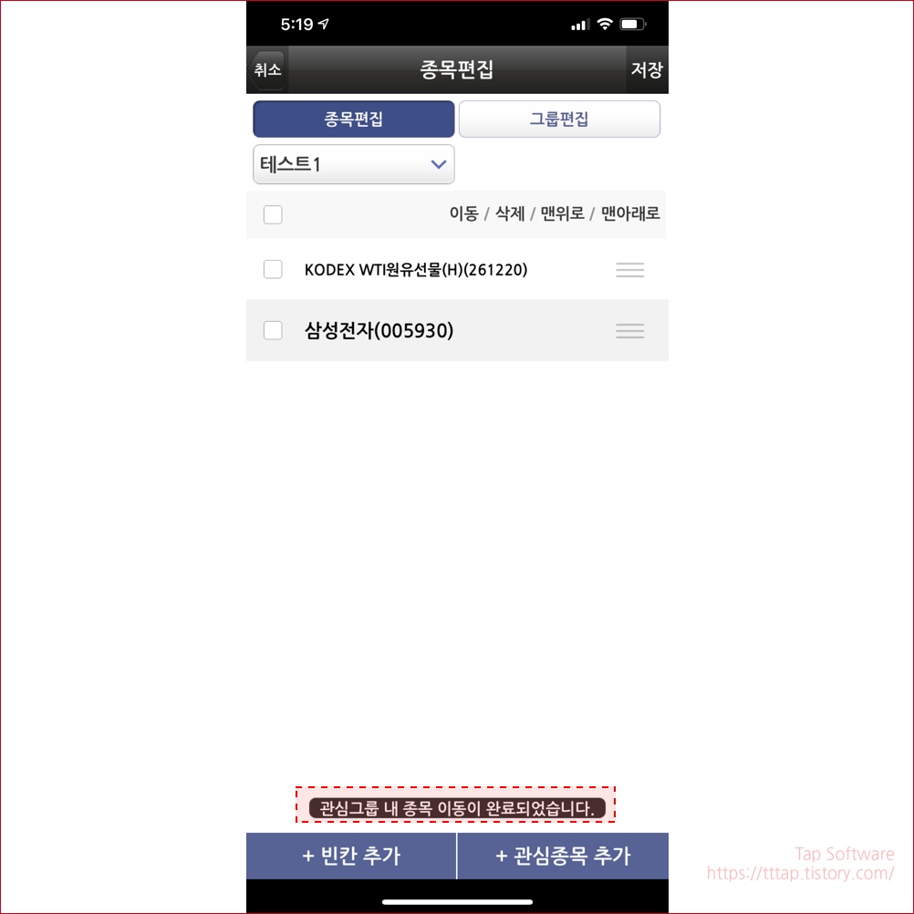 ▼ 20. 이동하기 버튼을 눌러서 이동합니다. 해당 종목이 사라지고 토스트 팝업으로 해당 종목의 이동을 알려줍니다. 이제 이동된 그룹에 가보면 해당 종목을 확인할 수 있습니다.