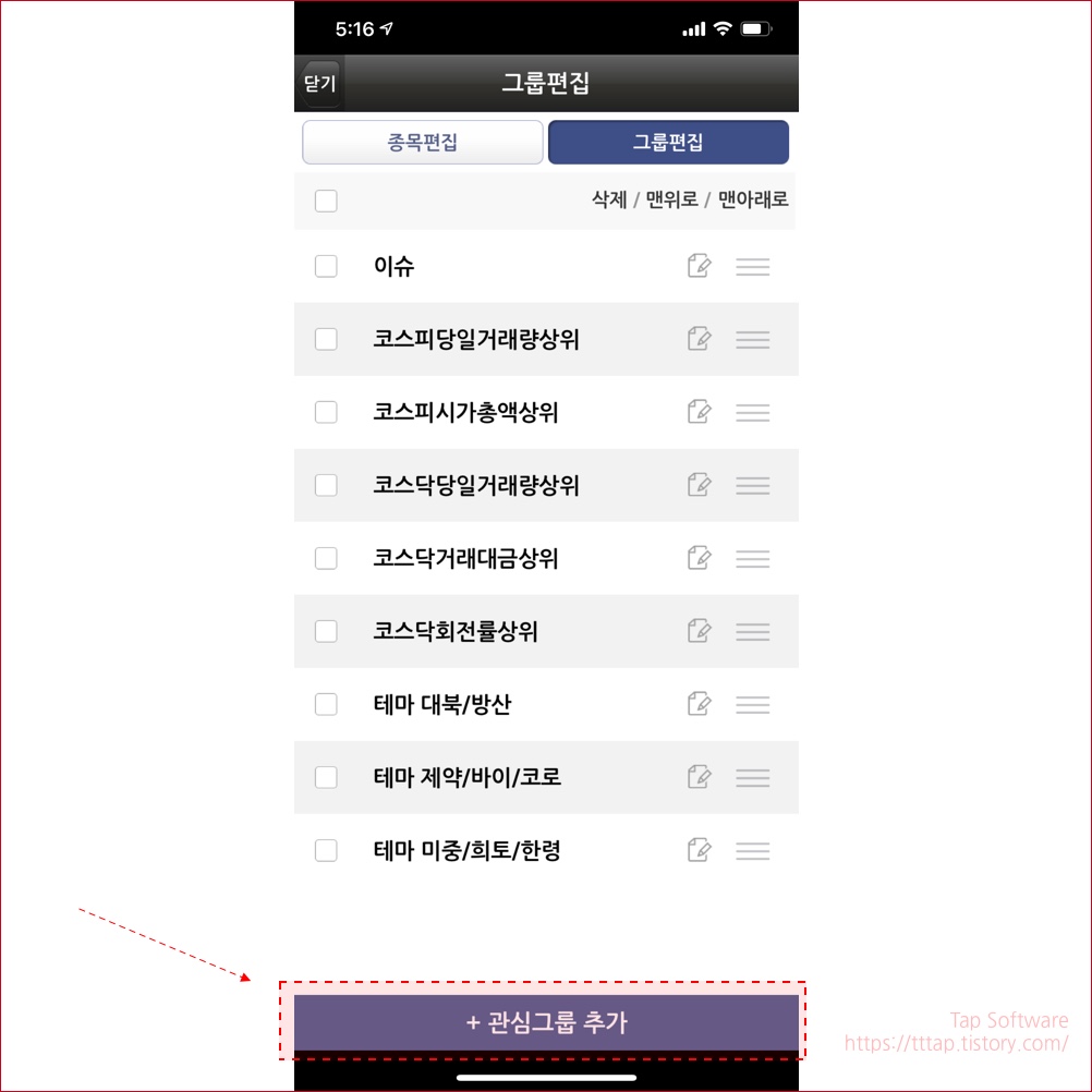 ▼ 2. 종목 편집 화면입니다. 우선 새로운 그룹을 추가하기 위해서 그룹편집 버튼을 누릅니다.