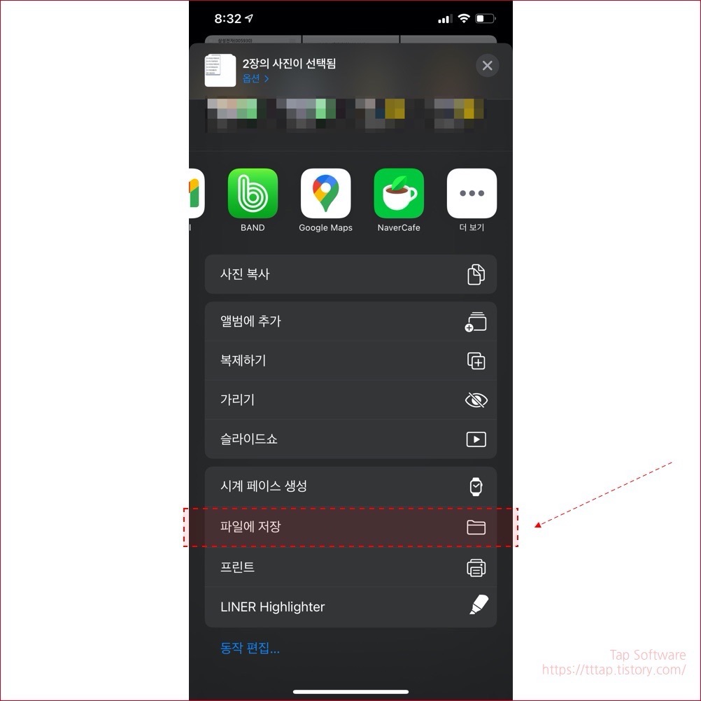 ▼ 2. 사진 두개를 선택합니다. 왼쪽 하단의 액션 버튼을 눌러 공유를 선택합니다.