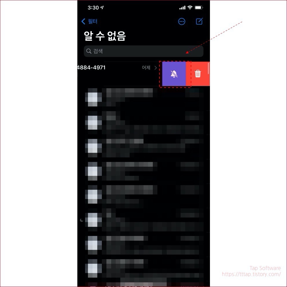 ▼ 3. 차단하고 싶은 문자메시지를 왼쪽으로 스와이프합니다.