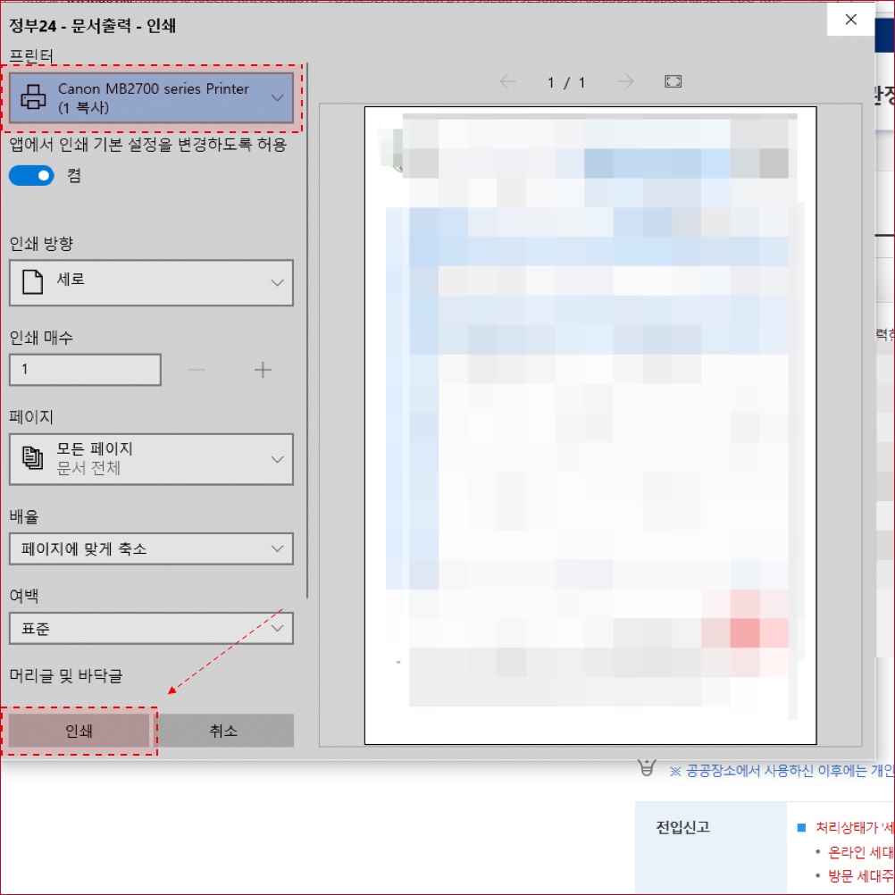 ▼ 16. 인쇄를 위해서 프린터를 선택하고 인쇄 버튼을 누릅니다. 만약 PDF로 출력하고 싶다면 프린터를 PDF로 설정하면 저장할 수 있습니다.