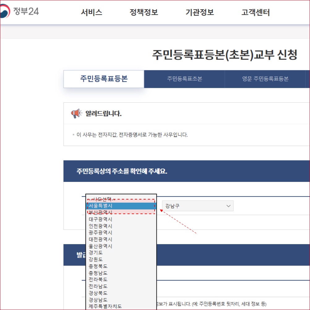 ▼ 9. 회원 신청하기를 누르시면 주민등록표등본(초본)교부 신청 화면으로 이동합니다. 제일 먼저 주민등록상의 주소를 선택해야 하는데요. 본인이 속한 지역을 선택하시면 됩니다. 보통 회원가입이 되어 있으면 자동으로 선택됩니다.