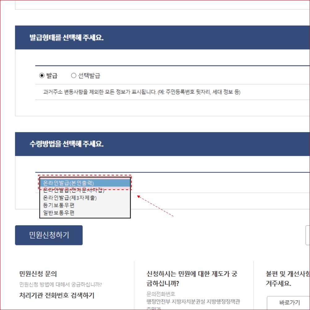 ▼ 11. 다음은 수령방법입니다. 프린트로 출력하거나 PDF로 저장하고 싶다면 온라인 발급으로 선택하셔야 합니다. 해당 비용은 무료입니다. 등기와 같은 서비스는 비용이 발생합니다.