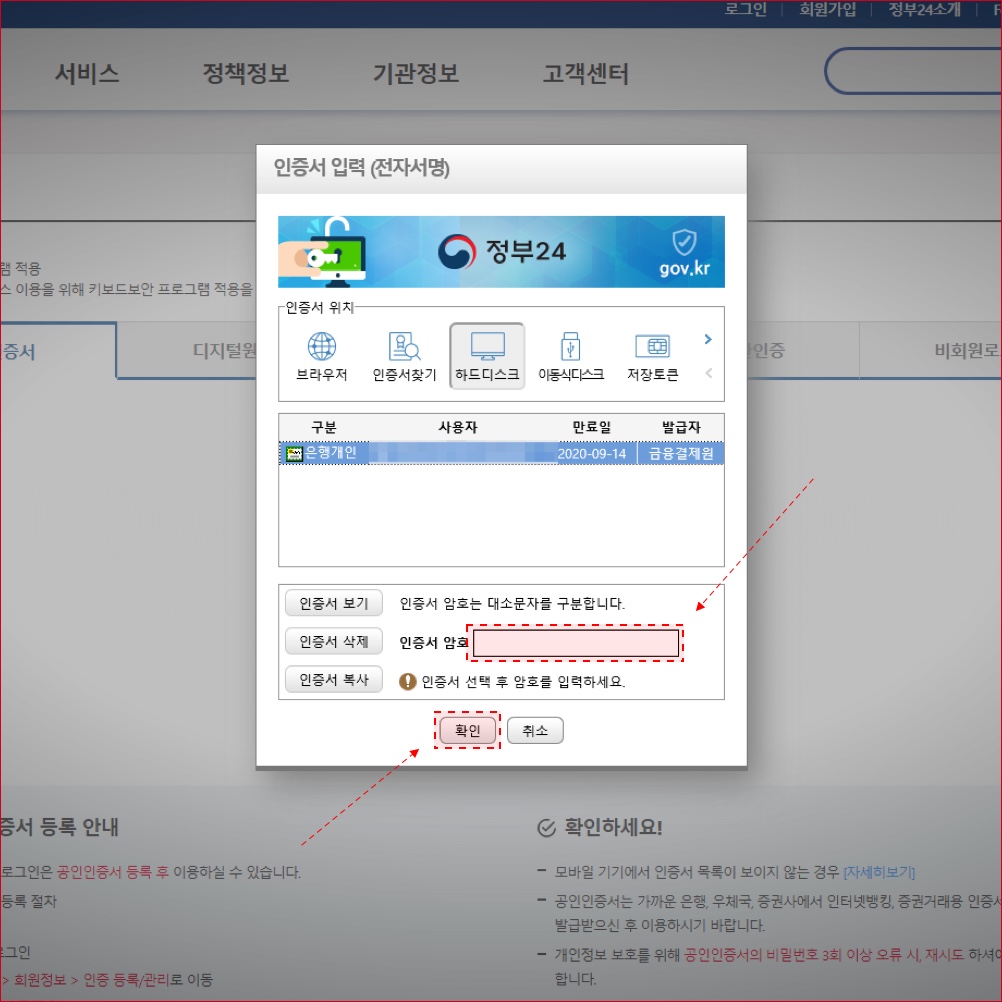 ▼ 7. 공인인증서 로그인을 위해서 인증서 암호를 입력하고 확인 버튼을 클릭합니다.