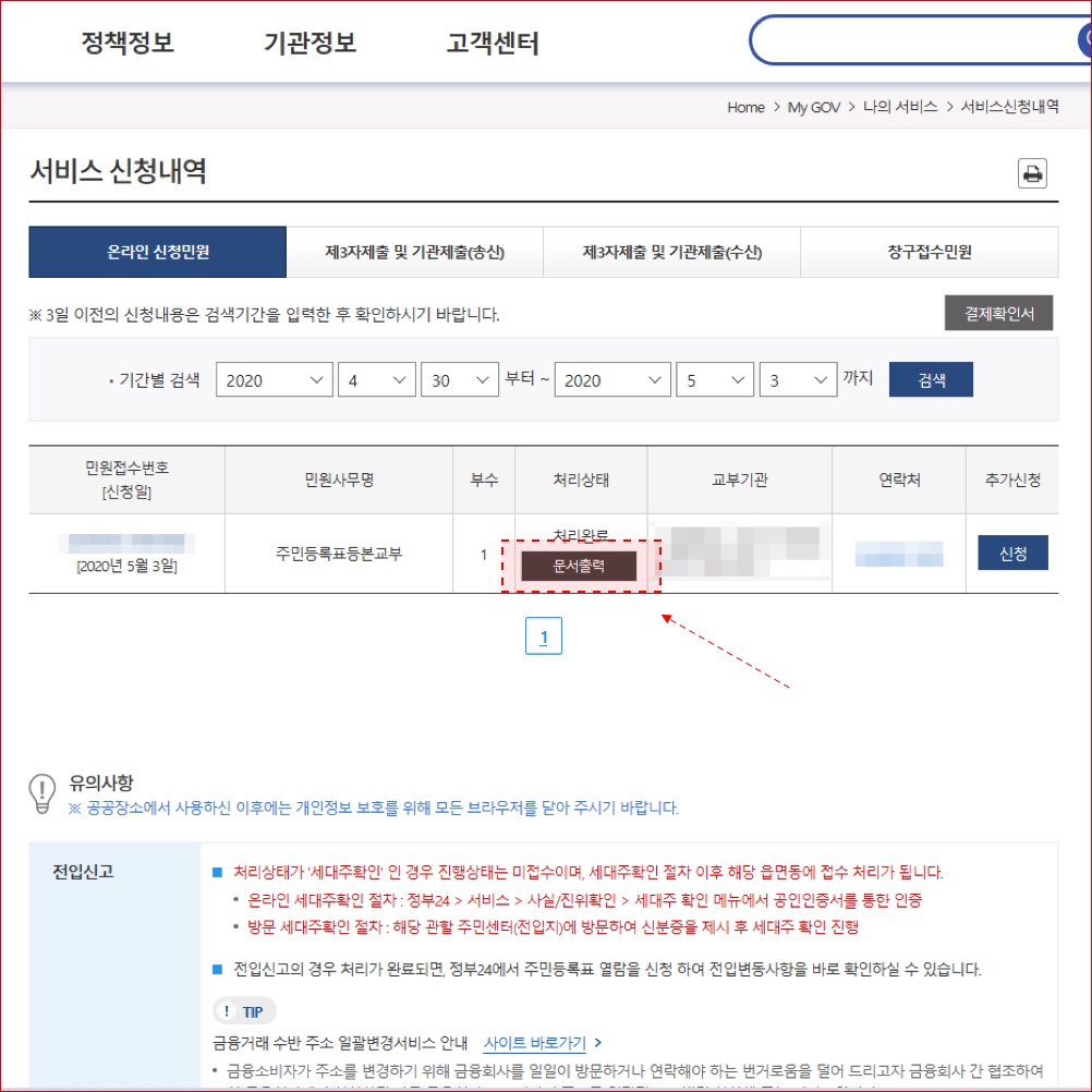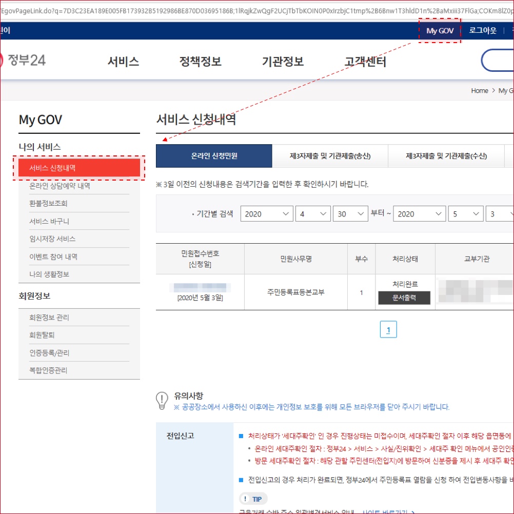 ▼ 17. 만약 웹브라우저가 꺼졌거나 다른 버튼을 눌러서 해당 화면이 종료되었다면 상단의 MyGOV 메뉴에서 서비스 신청내역을 누르면 조금 전에 신청한 주민등록등본 교부에 대한 신청민원을 확인할 수 있으니 참고하세요.