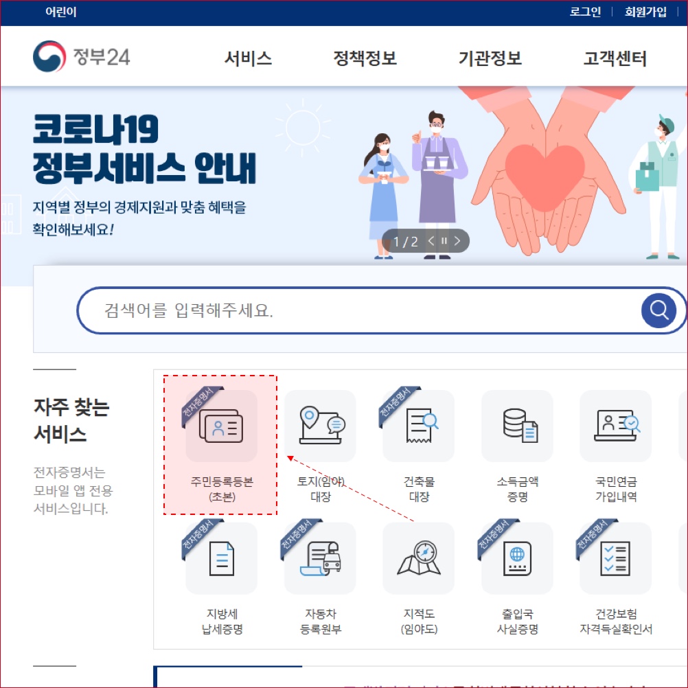 ▼ 1. 정부 24 웹페이지로 이동합니다. 웹페이지 이동후 메인화면에서 주민등록등본(초본)을 선택합니다.