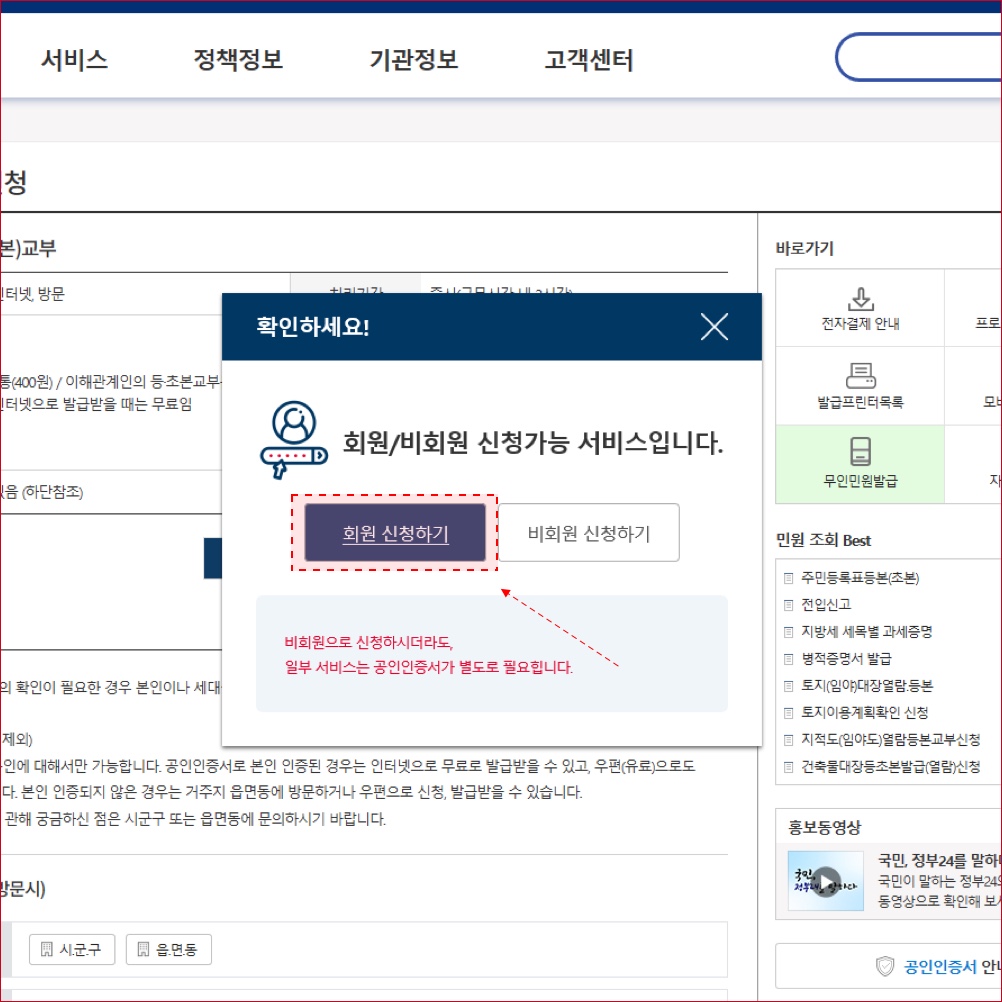 ▼ 8. 회원 신청하기와 비회원 신청하기가 나옵니다. 비회원 신청하기는 제약이 있으므로 원활한 서비스 이용을 위해서 회원 가입을 합니다.