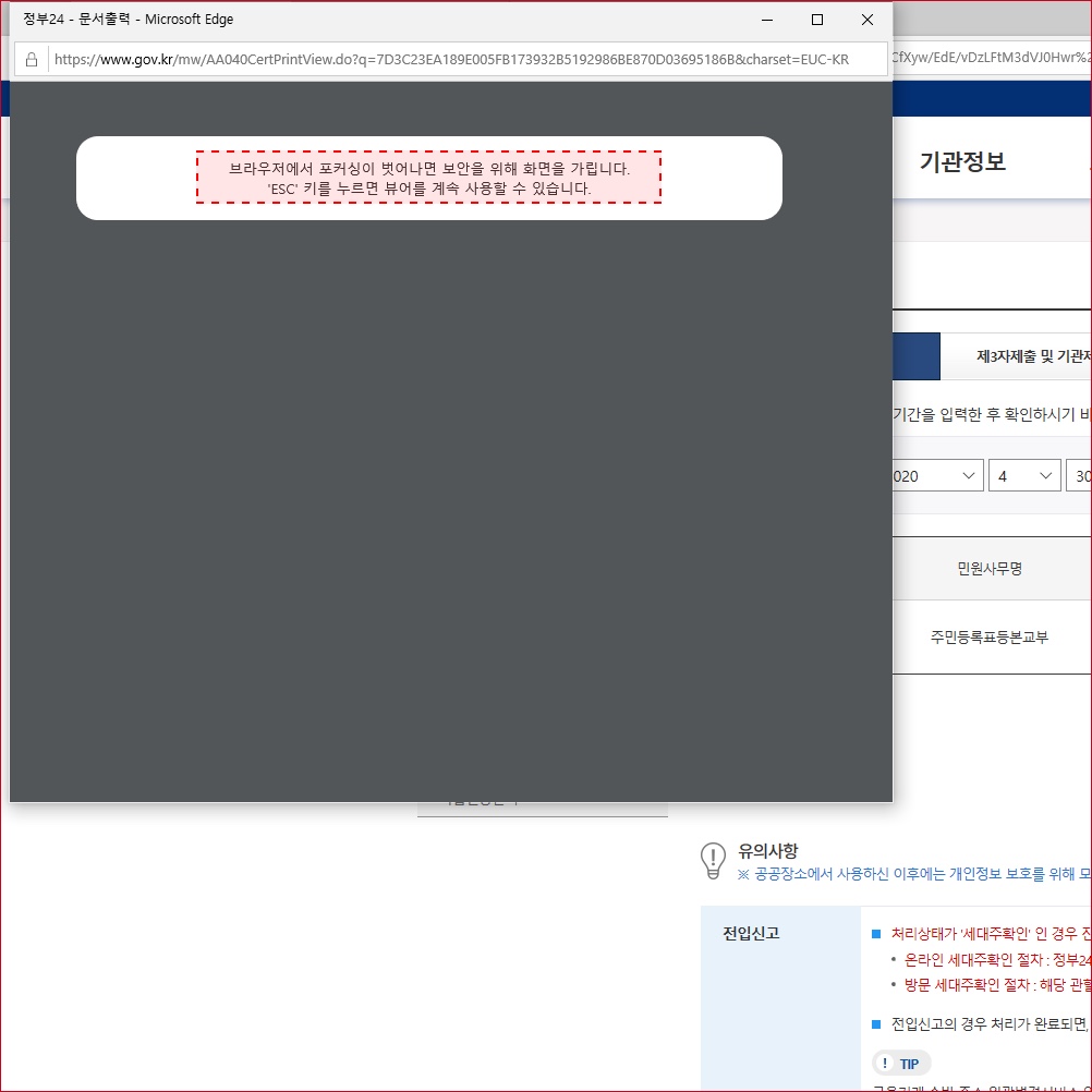 ▼ 14. 문서 출력에 앞서 보안을 위해 화면이 가려집니다 키보드의 ESC 키를 눌러서 뷰어의 보안 기능을 종료시킵니다.