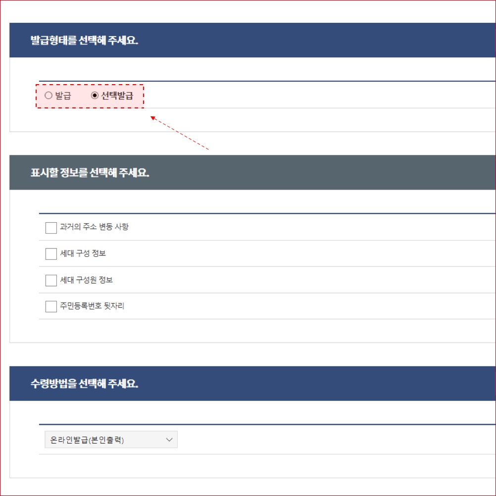 ▼ 10. 다음은 발급 형태입니다. 발급과 선택 발급이 있는데요. 발급은 기본 출력이고 선택 발급으로 주소지 변동사항, 세대원 정보 등을 가 리거 나 나타낼 수 있습니다. 보안을 위해서 주민등록번호 뒷자리를 가릴 수 도 있어요. 저는 일반 발급을 선택하겠습니다.