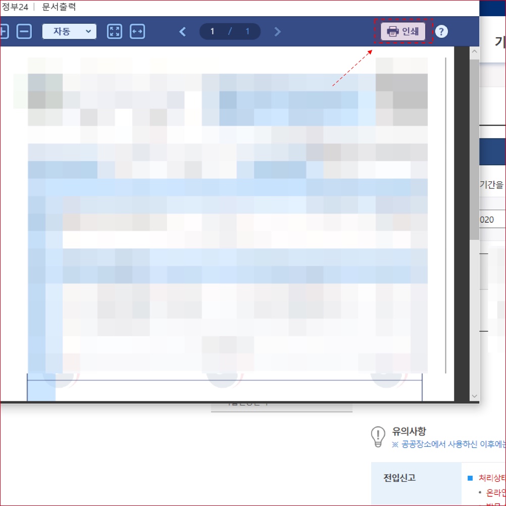 ▼ 15. 보안 기능이 꺼지면 주민등록등본 또는 초본 화면이 나옵니다. 인쇄 버튼을 클릭합니다.