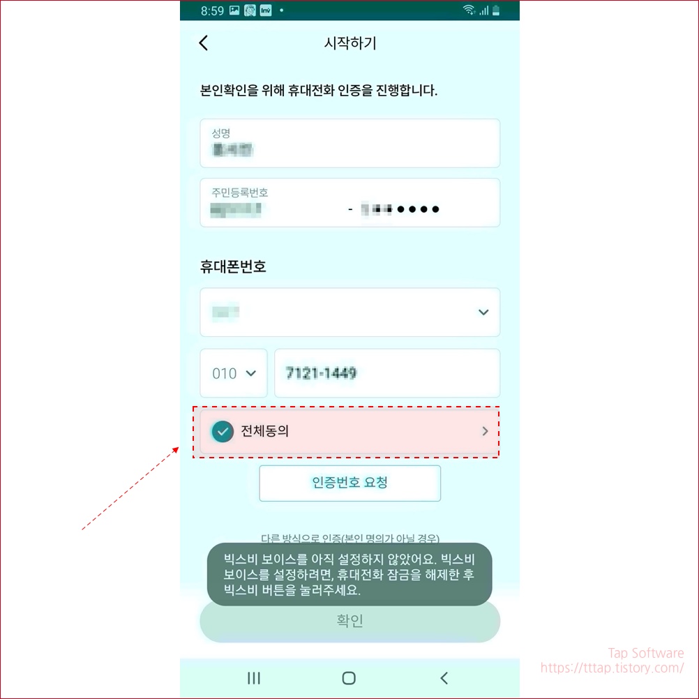 ▼ 3. 전화번호 인증을 하고 전체 동의를 눌러줍니다.