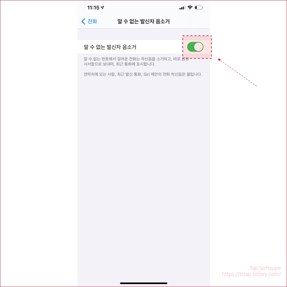 ▼ 4. 알 수없는 발신자 음소거 메뉴에서 스위치 버튼을 켜줍니다.