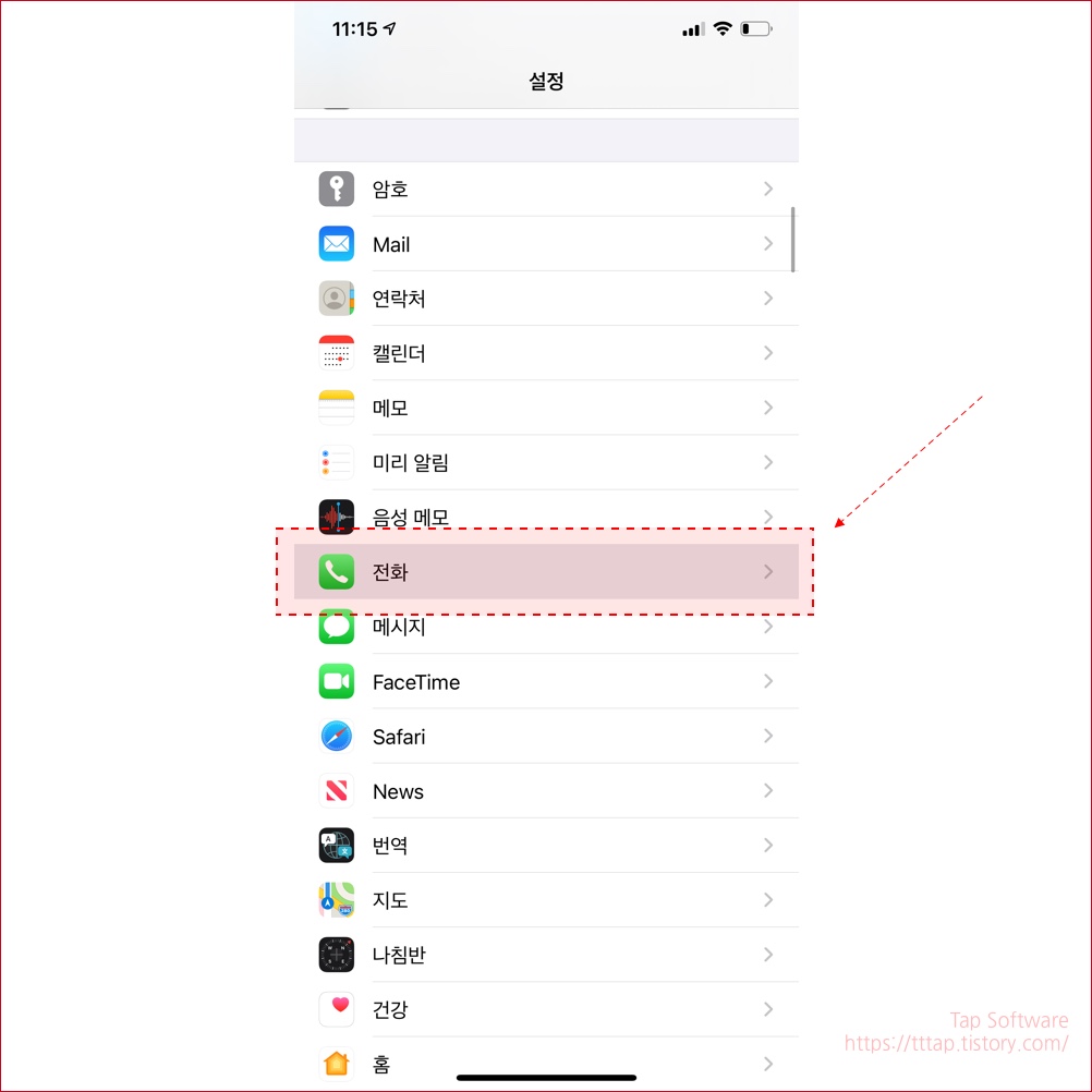 ▼ 2. 설정앱 실행후 중간으로 내리다보면 전화 앱설정이 있습니다. 선택합니다.